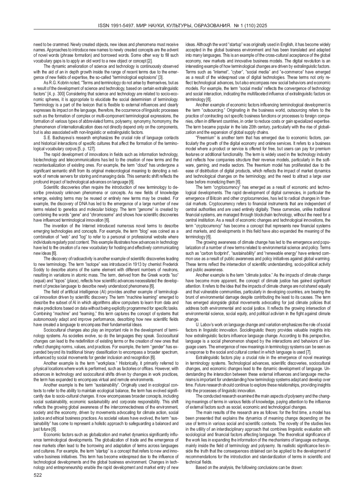 Научная значимость исследования подчеркивается тем фактом, что в нем изучается, как экстралингвистические факторы взаимодействуют с развитием терминологических систем в условиях глобализации. В статье раскрываются основные причины, природа и последствия семантических изменений, а также дается представление о том, насколько глубоко внешние факторы, такие как технический прогресс, научные открытия и социокультурные сдвиги, влияют на язык.