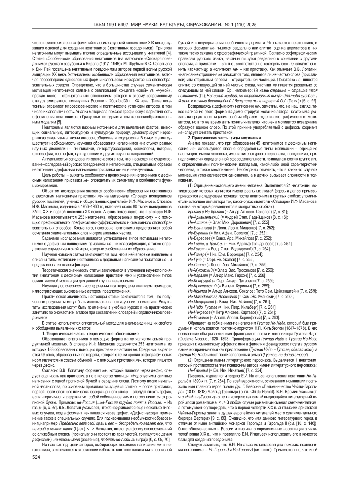В статье на материале «Словаря псевдонимов русских писателей, ученых и общественных деятелей» И. Ф. Масанова анализируются особенности образования негатонимов с дефисным написанием приставки не-, их значения, а также версии происхождения в русском языке. Основная задача исследования - анализировать семантические особенности таких слов, а также их мотивацию, включающую отрицание настоящего имени человека, литературного персонажа, псевдонима, принадлежности к определенной сфере деятельности, к группе лиц с определенными политическими взглядами, какой-либо иной характеристики человека, а также местоимений. Особое внимание уделяется механизмам создания негатонимов и их воздействию на восприятие читателя. Установлено, что в одних случаях мотивация негатонимов направлена на создание комического эффекта, что способствует привлечению внимания широкой аудитории. В других случаях мотивация негатонима связана с отражением актуальных событий и содержанием аллюзий, отсылающих к определенным реалиям или идеологическим контекстам. Обнаруживается, что на основе способности читателя «расшифровать» негатоним типы мотивации негатонимов с дефисным написанием приставки не- могут быть различны.