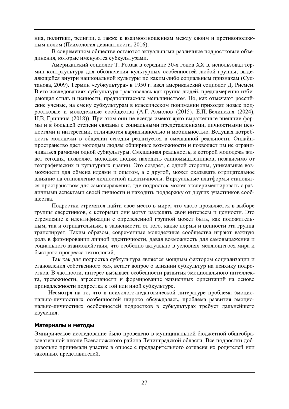 Прояснение эмоционально-личностных особенностей подросткового возраста является одной из самых интересных областей современной психологии. Ключевым периодом для формирования идентичности играет подростковый возраст (Хухлаева 2005). Его возрастные особенности способствуют становлению эмоционального интеллекта, входящего в структуру социального интеллекта, в рамках ведущей деятельности и социальной ситуации развития подростка (Психология девиантности, 2016). Именно в этом возрасте одной из ведущих потребностей становится общение со сверстниками, которое формирует определенный круг интересов и ценностей.