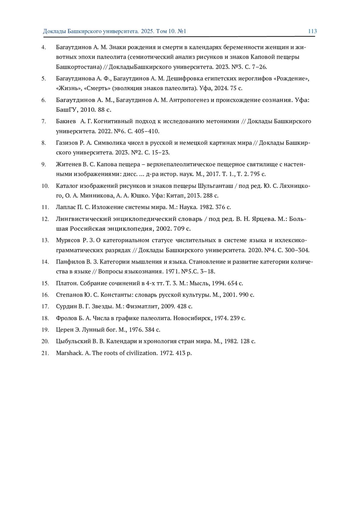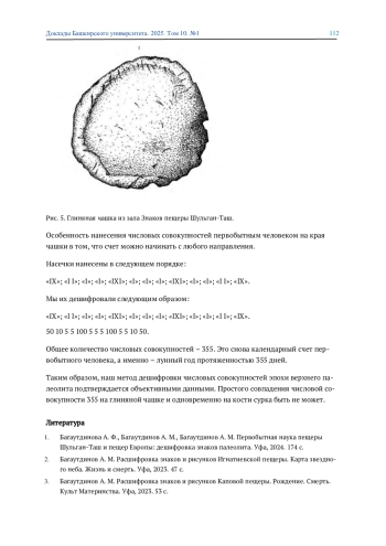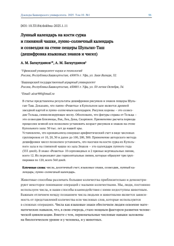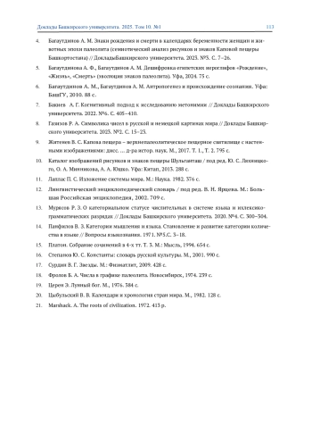 4. 	Багаутдинов А. М. Знаки рождения и смерти в календарях беременности женщин и животных эпохи палеолита (семиотический анализ рисунков и знаков Каповой пещеры Башкортостана) // ДокладыБашкирского университета. 2023. №3. С. 7-26. EDN: HAIFUS