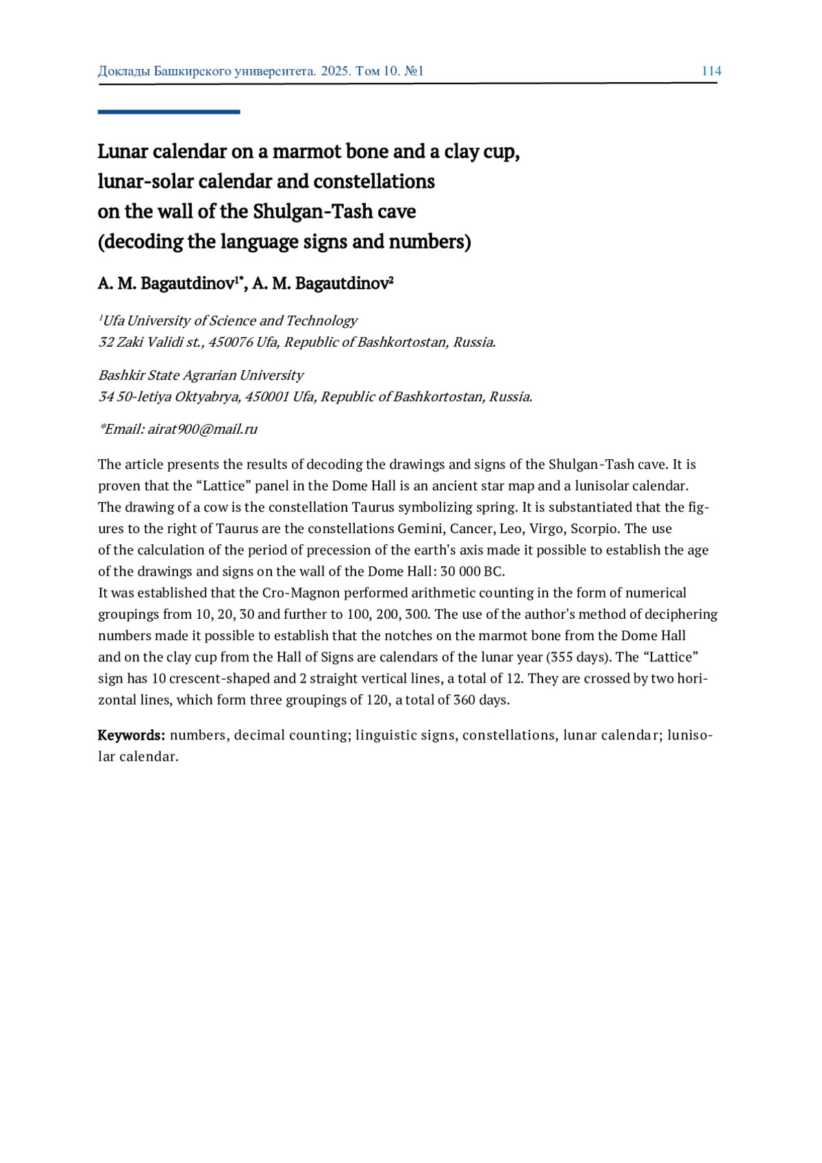 1. 	Багаутдинова А. Ф., Багаутдинов А. М., Багаутдинов А. М. Первобытная наука пещеры Шульган-Таш и пещер Европы: дешифровка знаков палеолита. Уфа, 2024. 174 с. EDN: HPIGBQ