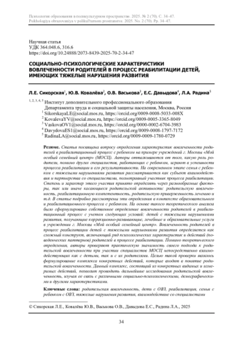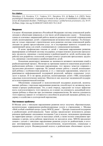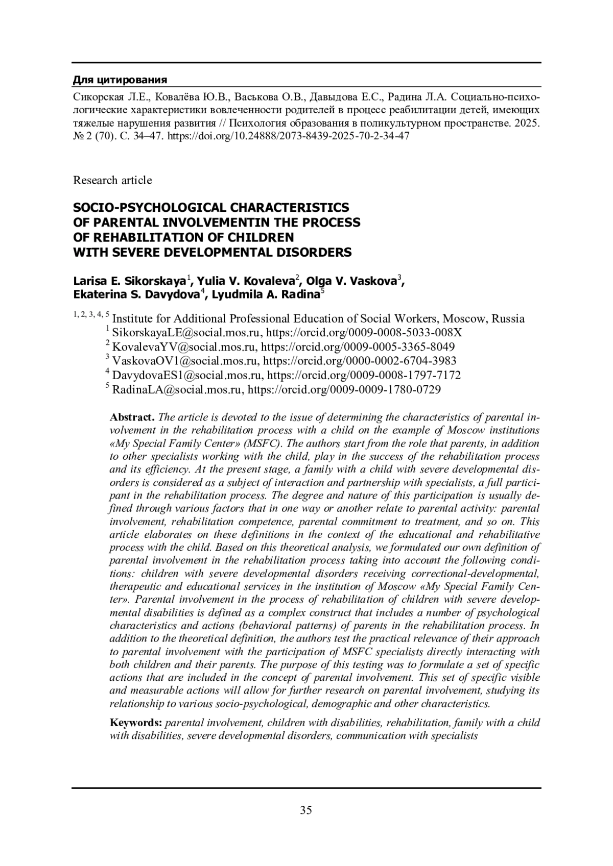 Статья посвящена вопросу определения характеристик вовлеченности родителей в реабилитационный процесс с ребенком на примере учреждений г. Москвы «Мой особый семейный центр» (МОСЦ). Авторы отталкиваются от того, какую роль родители, помимо других специалистов, работающих с ребенком, играют в успешности процесса реабилитации и его результативности. На современном этапе семья с ребенком с тяжелыми нарушениями развития рассматривается как субъект взаимодействия и партнерства со специалистами, полноправный участник процесса реабилитации. Степень и характер этого участия принято определять через разнообразные факторы, так или иначе касающиеся родительской активности: родительскую вовлеченность, реабилитационную компетентность, родительскую приверженность лечению и т. д. В статье подробно рассмотрены эти определения в контексте образовательного и реабилитационного процесса с ребенком. На основе такого теоретического анализа было сформулировано собственное определение вовлеченности родителей в реабилитационный процесс с учетом следующих условий: детей с тяжелыми нарушениями развития, получающие коррекционно-развивающие, лечебные и образовательные услуги в учреждении г. Москвы «Мой особый семейный центр». Вовлеченность родителей в процесс реабилитации детей с тяжелыми нарушениями развития определяется как сложный конструкт, включающий ряд психологических характеристик и действий (поведенческих паттернов) родителей в процессе реабилитации. Помимо теоретического определения, авторы проверяют практическую значимость своего подхода к родительской вовлеченности при участии специалистов МОСЦ непосредственно взаимодействующих как с детьми, так и с их родителями. Целью такой проверки являлось формулирование комплекса конкретных действий, которые входят в понятие родительской вовлеченности. Данный комплекс, состоящий из конкретных видимых и измеримых действий, позволит проводить дальнейшие исследования родительской вовлеченность, изучая ее связь с различными социально-психологическими, демографическими и другими характеристиками.