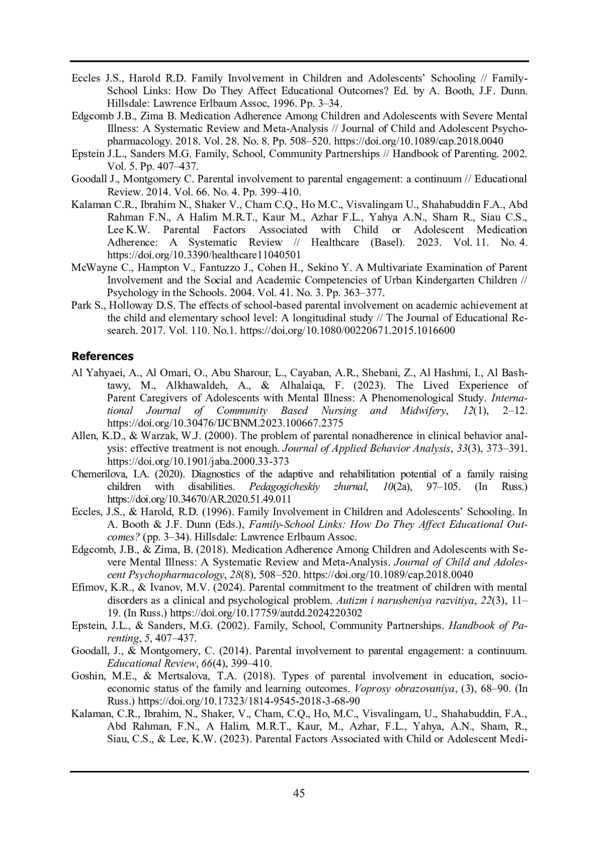 18. 	Kalaman C.R., Ibrahim N., Shaker V., Cham C.Q., Ho M.C., Visvalingam U., Shahabuddin F.A., Abd Rahman F.N., A Halim M.R.T., Kaur M., Azhar F.L., Yahya A.N., Sham R., Siau C.S., Lee K.W. Parental Factors Associated with Child or Adolescent Medication Adherence: A Systematic Review // Healthcare (Basel). 2023. Vol. 11. No. 4. DOI: 10.3390/healthcare11040501