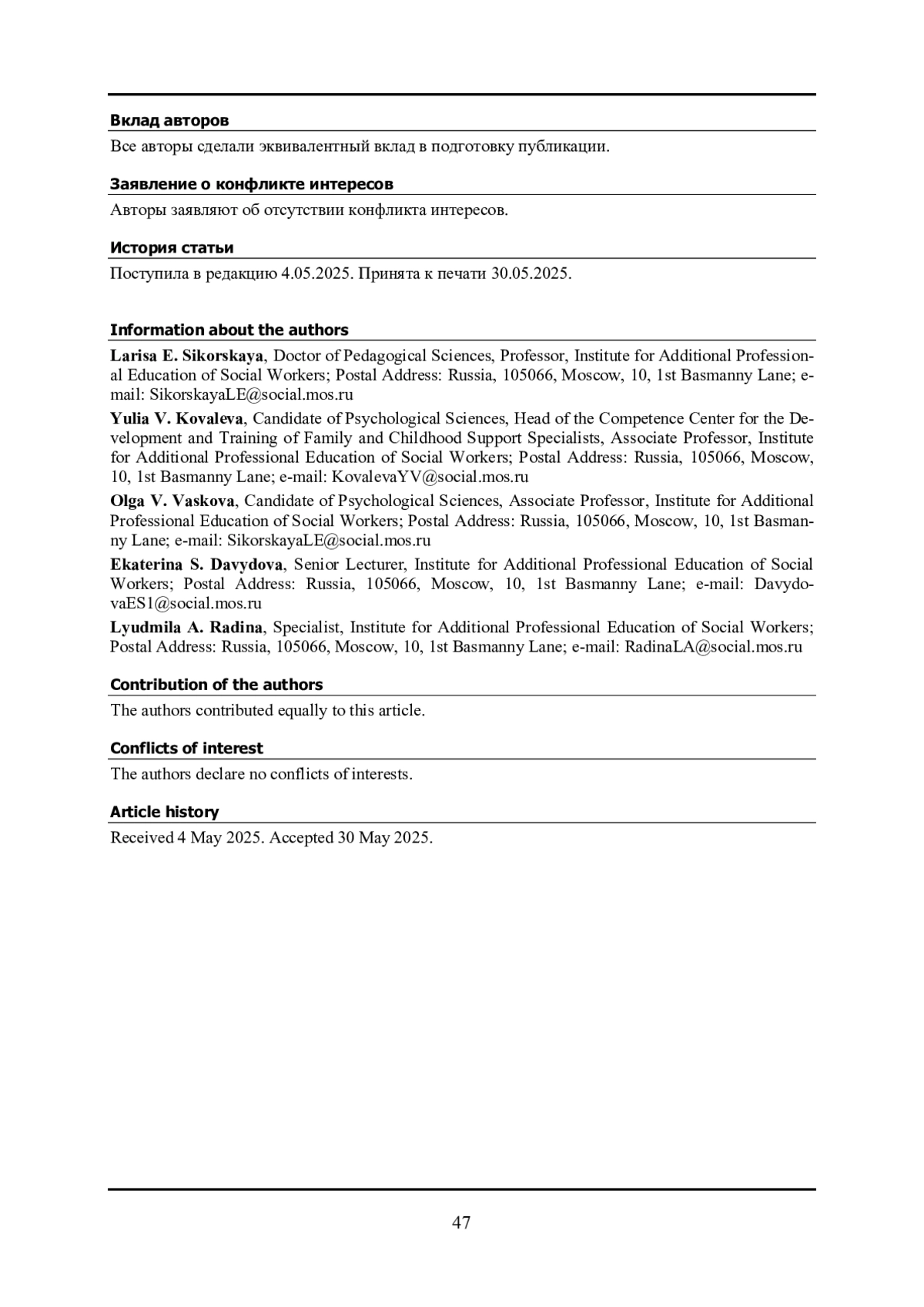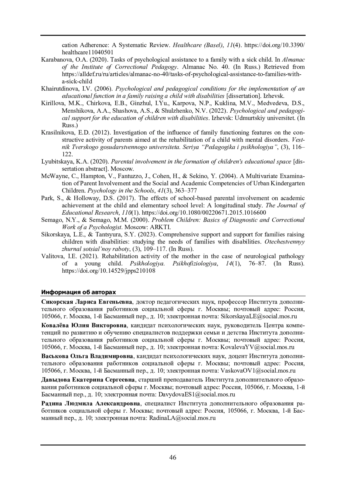 9. 	Сикорская Л.Е., Танцюра С.Ю. Комплексное сопровождение и поддержка семей, воспитывающих детей с ОВЗ: изучение потребностей семей с ОВЗ // Отечественный журнал социальной работы. 2023. № 3 (94). С. 109-117.