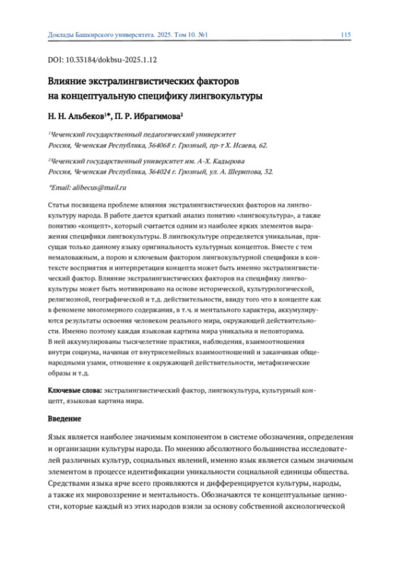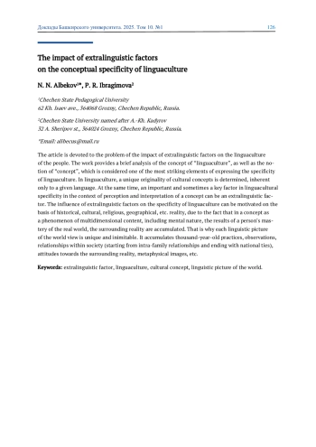 Статья посвящена проблеме влияния экстралингвистических факторов на лингвокультуру народа. В работе дается краткий анализ понятию «лингвокультура», а также понятию «концепт», который считается одним из наиболее ярких элементов выражения специфики лингвокультуры. В лингвокультуре определяется уникальная, присущая только данному языку оригинальность культурных концептов. Вместе с тем немаловажным, а порою и ключевым фактором лингвокультурной специфики в контексте восприятия и интерпретации концепта может быть именно экстралингвистический фактор. Влияние экстралингвистических факторов на специфику лингвокультуры может быть мотивировано на основе исторической, культурологической, религиозной, географической и т. д. действительности, ввиду того что в концепте как в феномене многомерного содержания, в т. ч. и ментального характера, аккумулируются результаты освоения человеком реального мира, окружающей действительности. Именно поэтому каждая языковая картина мира уникальна и неповторима. В ней аккумулированы тысячелетние практики, наблюдения, взаимоотношения внутри социума, начиная от внутрисемейных взаимоотношений и заканчивая общенародными узами, отношение к окружающей действительности, метафизические образы и т. д.