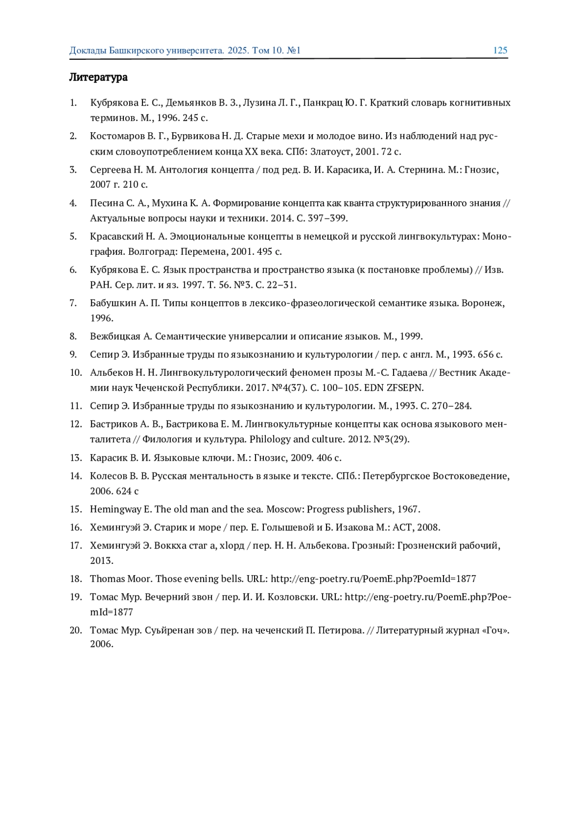 10. 	Альбеков Н. Н. Лингвокультурологический феномен прозы М.-С. Гадаева // Вестник Академии наук Чеченской Республики. 2017. №4(37). С. 100-105. EDN: ZFSEPN