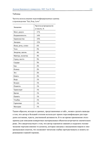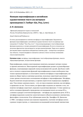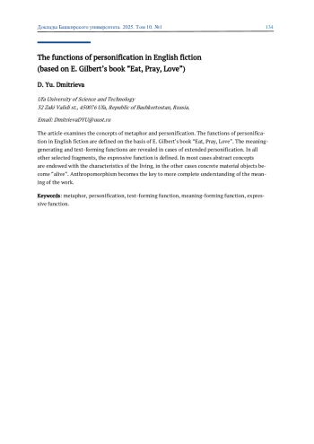 В статье рассматриваются понятия метафоры и персонификации. Выделяются функции персонификации в английском художественном тексте на примере произведения Э. Гилберт “Eat, Pray, Love”. Смыслопорождающая и текстообразующая функции выявлены в случаях развернутой персонификации. Во всех остальных выделенных фрагментах просвечивается экспрессивная функция. Чаще всего характеристиками живого наделяются абстрактные понятия, реже - конкретные материальные объекты. Антропоморфизм становится ключом к более полному пониманию смысла произведения.
