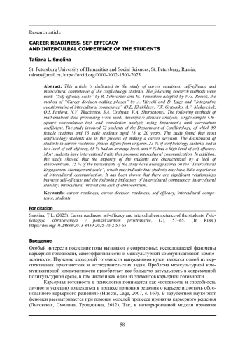 Статья посвящена исследованию карьерной готовности, самоэффективности и межкультурной компетентности у студентов-конфликтологов. Были использованы следующие методики исследования: «Шкала самоэффективности» Р. Шварцера и М. Ерусалема в адаптации В. Г. Ромека, методика «Фазы принятия карьерного решения» A. Hirschi и D. Lage и «Интегративный опросник межкультурной компетентности» (О. Е. Хухлаев, В. В. Гриценко, А. В. Макарчук, О. С. Павлова, Н. В. Ткаченко, Ш. А. Усубян, В. А. Шорохова). В качестве методов математической обработки данных применялись: анализ описательных статистик, одновыборочный критерий согласия Хи-квадрат и корреляционный анализ с использованием коэффициента ранговой корреляции Спирмена. В исследовании приняло участие 72 студента факультета конфликтологии, из них 59 девушек и 13 юношей в возрасте от 18 до 20 лет. Было выявлено, что большинство студентов-конфликтологов находятся в процессе принятия карьерного решения. Распределение студентов по фазам карьерной готовности отличается от равномерного. У 23 % студентов-конфликтологов выявлен низкий уровень самоэффективности, у 68 % - средний уровень, у 9 % - высокий уровень самоэффективности. У большинства студентов обнаружены межкультурные черты, способствующие межкультурной коммуникации. Кроме того, исследование показало, что для большинства студентов-конфликтологов характерно отсутствие этноцентризма. У 75 % участников исследования - средние показатели по шкале «Управление межкультурным взаимодействием», что может указывать на то, что у студентов, возможно, небольшой опыт межкультурного общения. Показано, что существуют значимые взаимосвязи между самоэффективностью и следующими показателями межкультурной компетентности: межкультурная стабильность, межкультурный интерес и отсутствие этноцентризма.