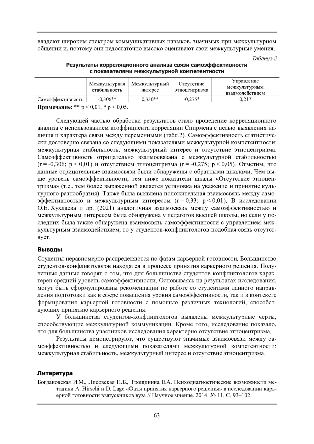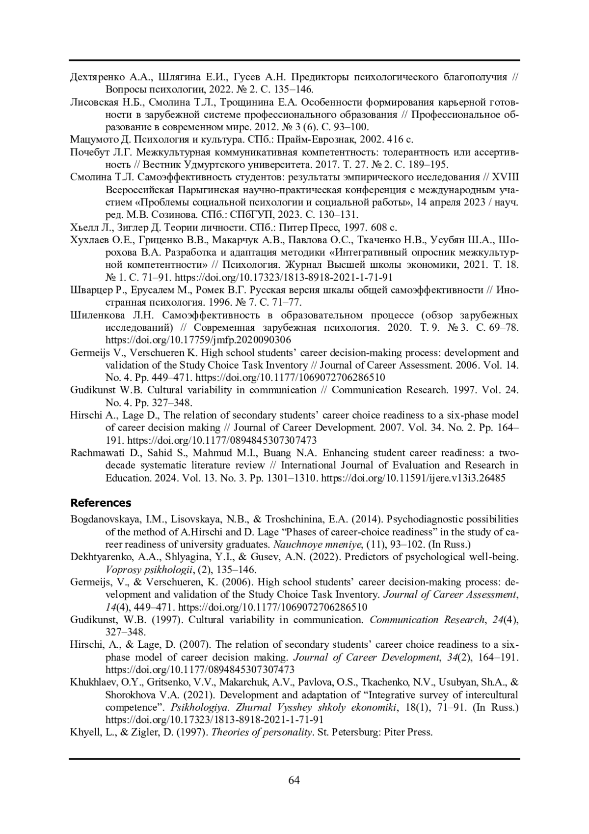 1. 	Богдановская И.М., Лисовская Н.Б., Трощинина Е.А. Психодиагностические возможности методики A. Hirschi и D. Lage “Фазы принятия карьерного решения” в исследовании карьерной готовности выпускников вуза // Научное мнение. 2014. № 11. С. 93-102. EDN: TKQGGH