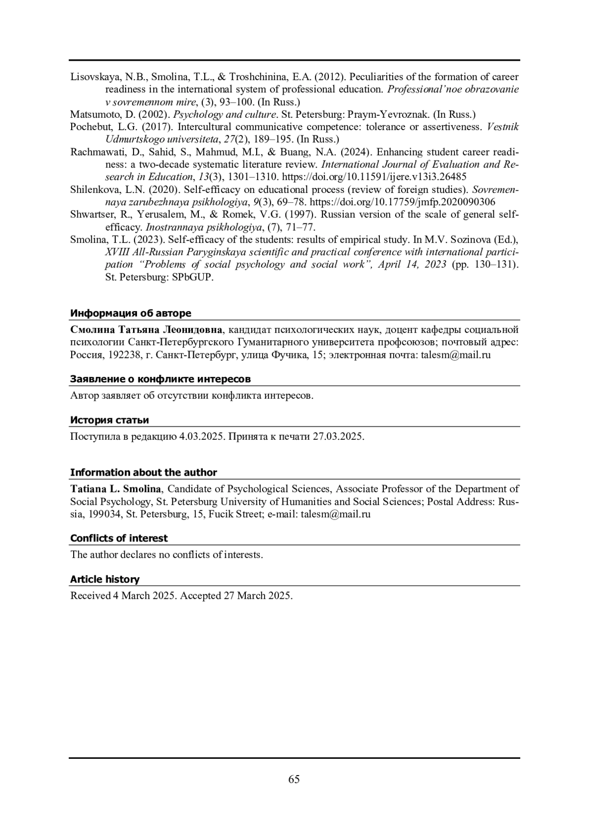3. 	Лисовская Н.Б., Смолина Т.Л., Трощинина Е.А. Особенности формирования карьерной готовности в зарубежной системе профессионального образования // Профессиональное образование в современном мире. 2012. № 3 (6). С. 93-100.