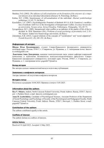 В статье представлены результаты исследования внутриличностного конфликта и его влияния на социальную адаптацию и самоактуализацию личности как факторов социализации. Вопросы изучения социальной адаптации, самоактуализации внутриличностного конфликта, по мнению автора, представляют интерес для работников помогающих профессий в социальной и психологической диагностике и помощи. Автор, опираясь на теоретические работы, предполагает, что социализация личности - это процесс приобщения, адаптации к нормам, ценностям общества, группы, где живет и развивается личность. Такое понимание процессов социальной адаптации и социализации личности позволяет поставить между ними знак равенства. При этом акцентируется внимание на том, что некоторые исследователи полагают, что процесс социальной адаптации и социализации личности протекает значительно успешнее у лиц с такими характеристиками ценностно-мотивационной сферы личности, которые определяют ее стремление к самоактуализации. Внутриличностный конфликт, то есть несовпадение целевой, ценностной и смысловой сфер, может привести к дезадаптации и нарушению процесса социализации. В результате исследования было доказано, что уровень проявления внутриличностного конфликта оказывает влияние на процесс социализации: именно испытуемые с высоким уровнем внутренней конфликтности меньше разделяют ценности самоактуализирующейся личности, испытывают эмоциональный дискомфорт в ситуации социального взаимодействия, избегают проблемных ситуаций, склонны к подчинению, принятию воли других. Также, было выявлено, что уровень внутриличностной конфликтности повышается и углубляется, когда у личности начинает разворачиваться конфликт вокруг экзистенциальных ценностей, что приводит к дезадаптации личности, ее закрытости от внешнего мира, снижению мотивации.