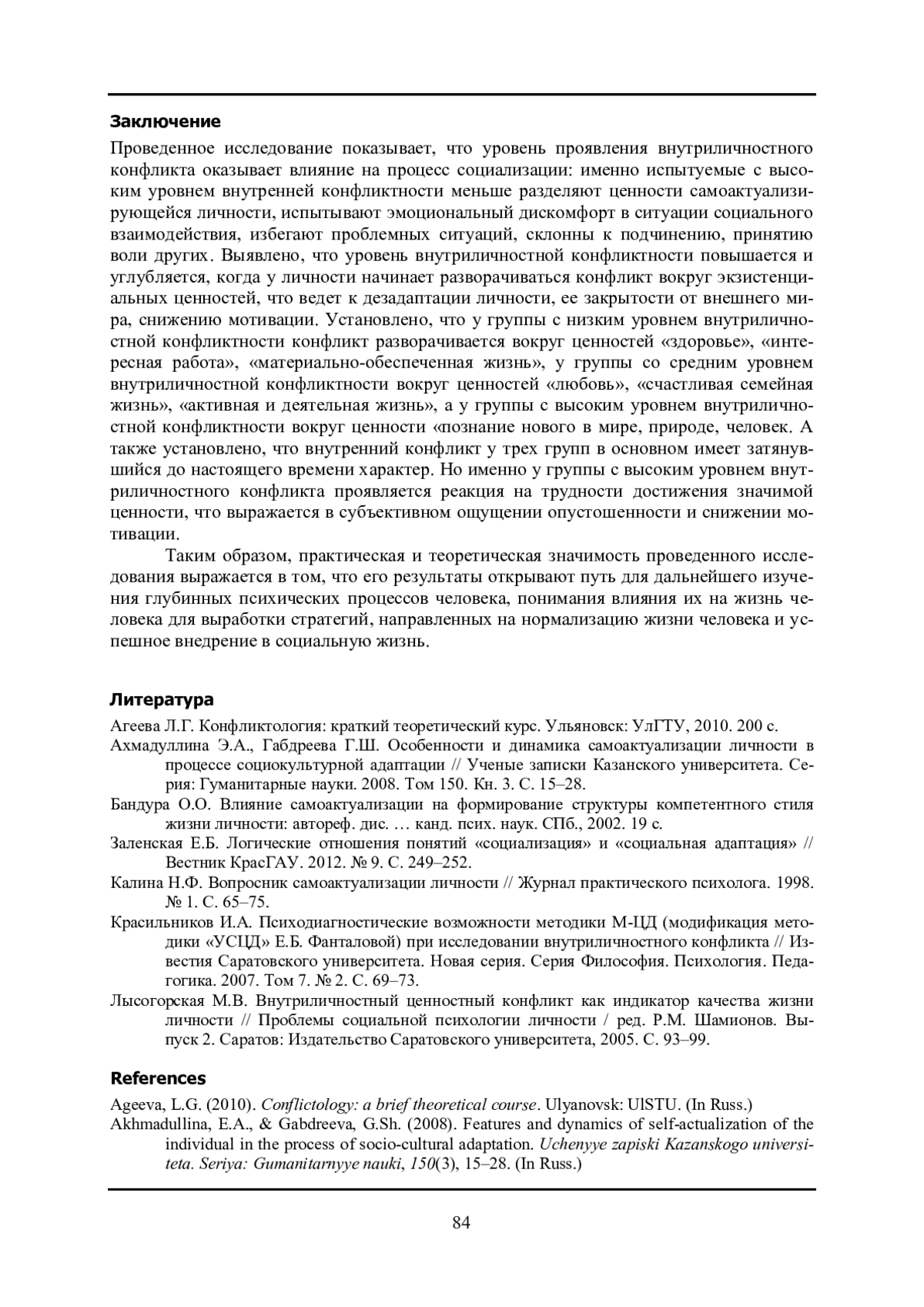 2. 	Ахмадуллина Э.А., Габдреева Г.Ш. Особенности и динамика самоактуализации личности в процессе социокультурной адаптации // Ученые записки Казанского университета. Серия: Гуманитарные науки. 2008. Том 150. Кн. 3. С. 15-28.