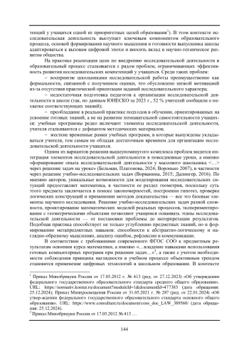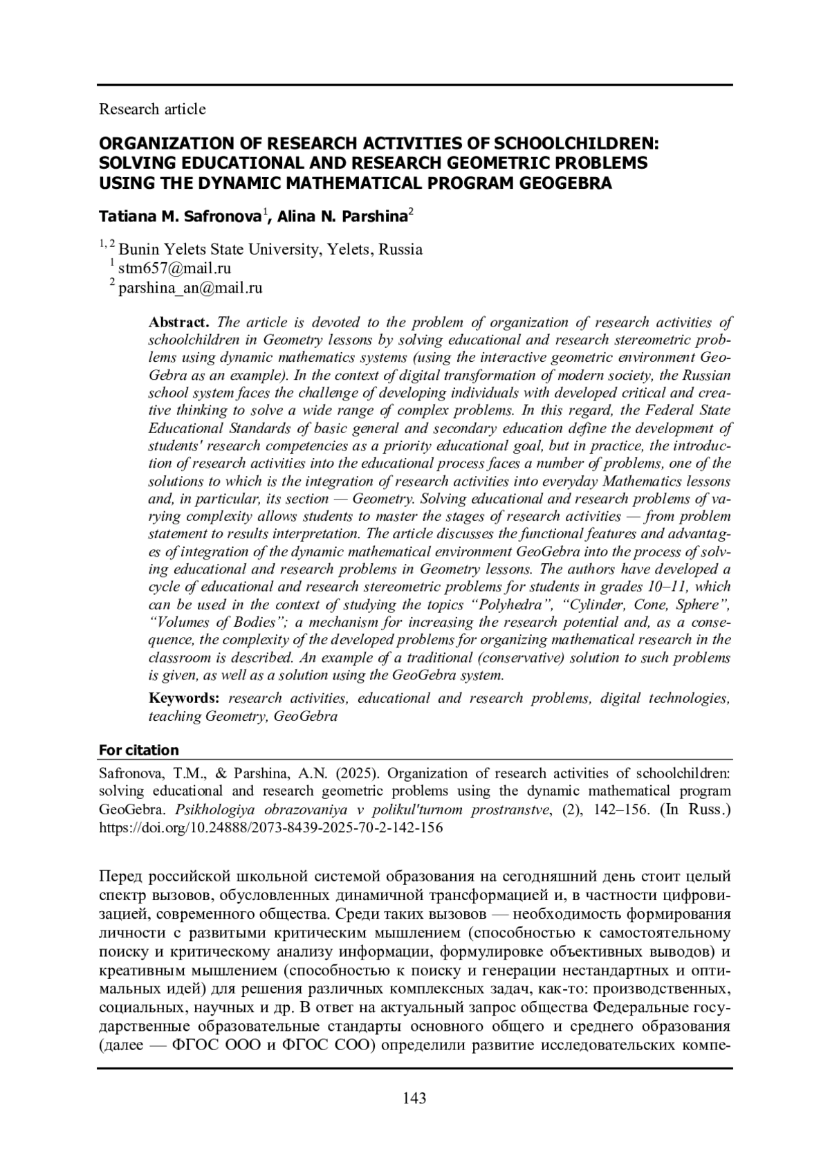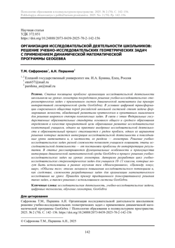 Статья посвящена проблеме организации исследовательской деятельности школьников на уроках геометрии посредством решения учебно-исследовательских стереометрических задач с применением систем динамической математики (на примере интерактивной геометрической среды GeoGebra). В условиях цифровой трансформации современного общества перед российской школьной системой стоит задача формирования личности, обладающей развитыми критическим и креативным мышлением для решения широкого спектра комплексных задач. В связи с этим Федеральные государственные образовательные стандарты основного общего и среднего образования определяют в качестве приоритетной цели образования развитие исследовательских компетенций учащихся, однако на практике внедрение исследовательской деятельности в образовательный процесс сталкивается с рядом проблем, одним из вариантов решения которых является интеграция исследовательской деятельности в повседневные уроки математики и, в частности, ее раздела - геометрии. Решение учебно-исследовательских задач разной сложности позволяет учащимся осваивать этапы исследовательской деятельности - от постановки проблемы до интерпретации результатов. В статье рассматриваются функциональные особенности и преимущества интеграции динамической математической среды GeoGebra в процесс решения учебно-исследовательских задач на уроках геометрии. Авторами разработан цикл учебно-исследовательских стереометрических задач для учащихся 10-11 классов, которые могут быть использованы в рамках изучения тем «Многогранники», «Цилиндр, конус, шар», «Объемы тел»; описан механизм повышения исследовательского потенциала и, как следствие, сложности разработанных задач для организации математического исследования на уроке. Приведен пример традиционного (консервативного) решения таких задач, а также решения с использованием системы GeoGebra.