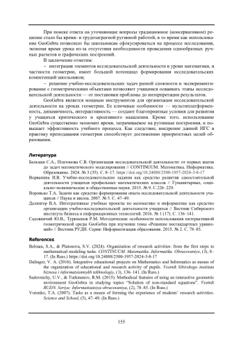 1. 	Бельман С.А., Платонова С.В. Организация исследовательской деятельности: от первых шагов до задач математического моделирования // CONTINUUM. Математика. Информатика. Образование. 2024. № 3 (35). С. 8-17. DOI: 10.24888/2500-1957-2024-3-8-17