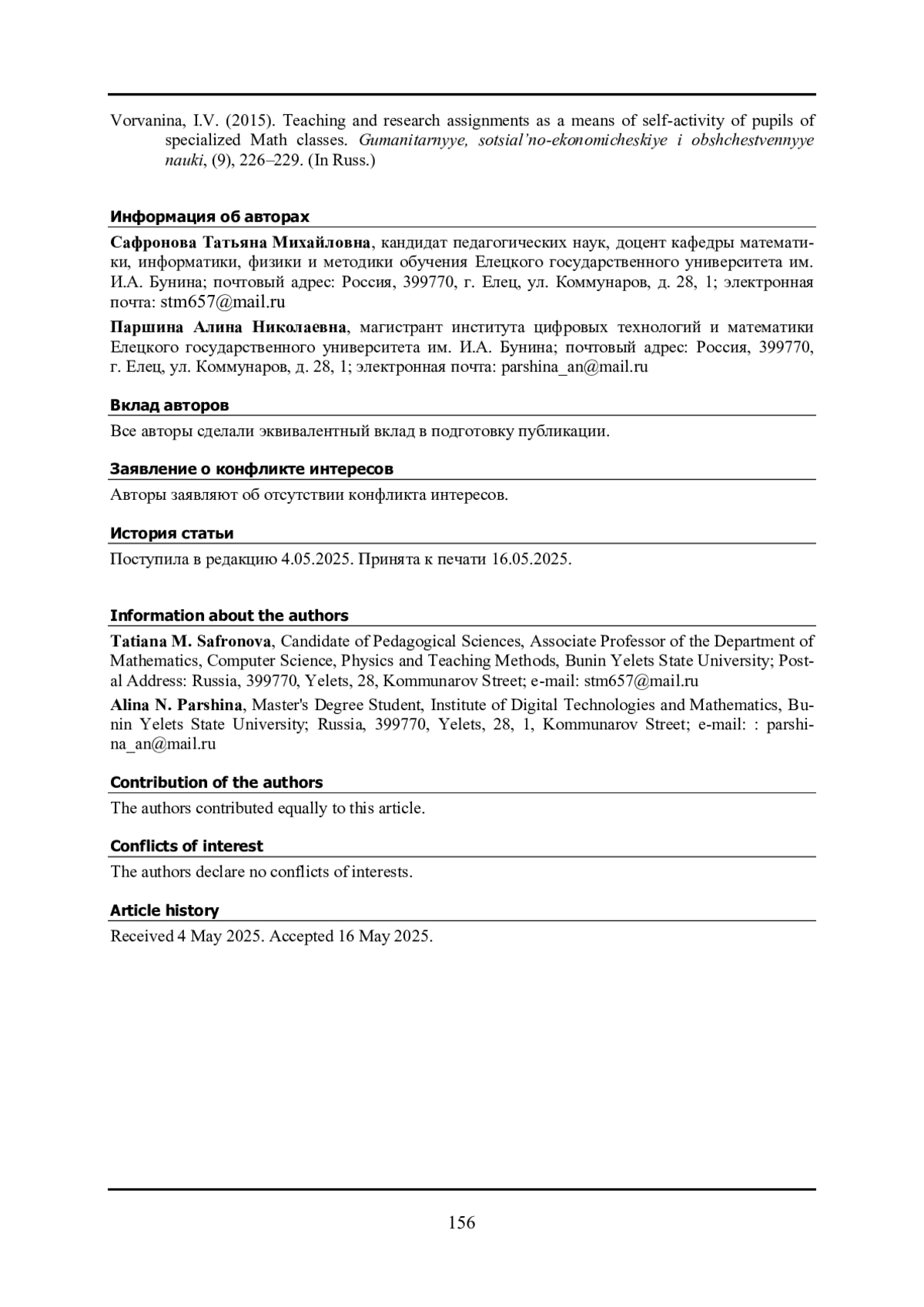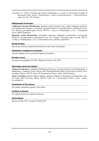 2. 	Ворванина И.В. Учебно-исследовательские задания как средство развития самостоятельной деятельности учащихся профильных математических классов // Гуманитарные, социально-экономические и общественные науки. 2015. № 9. С.226-229.