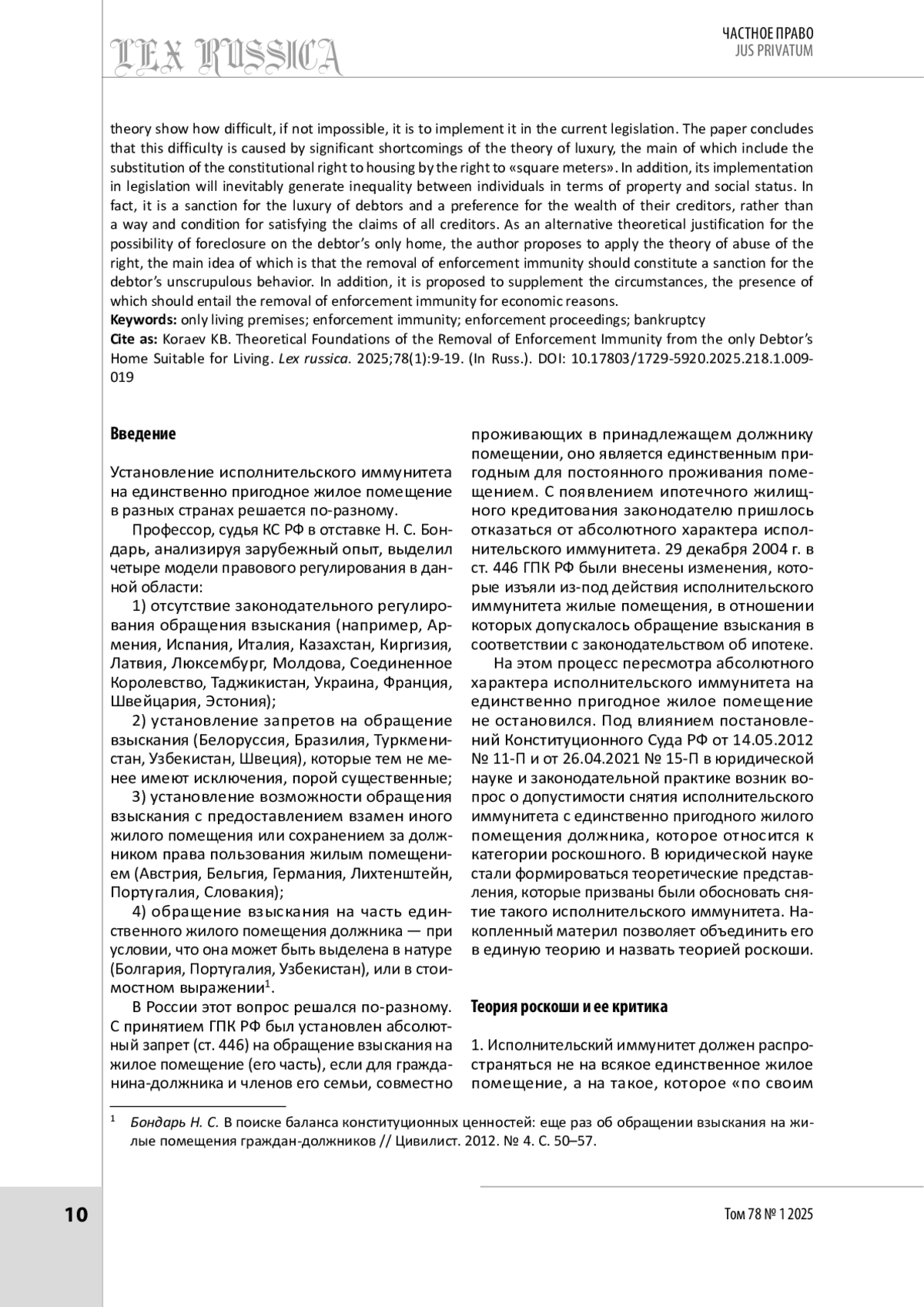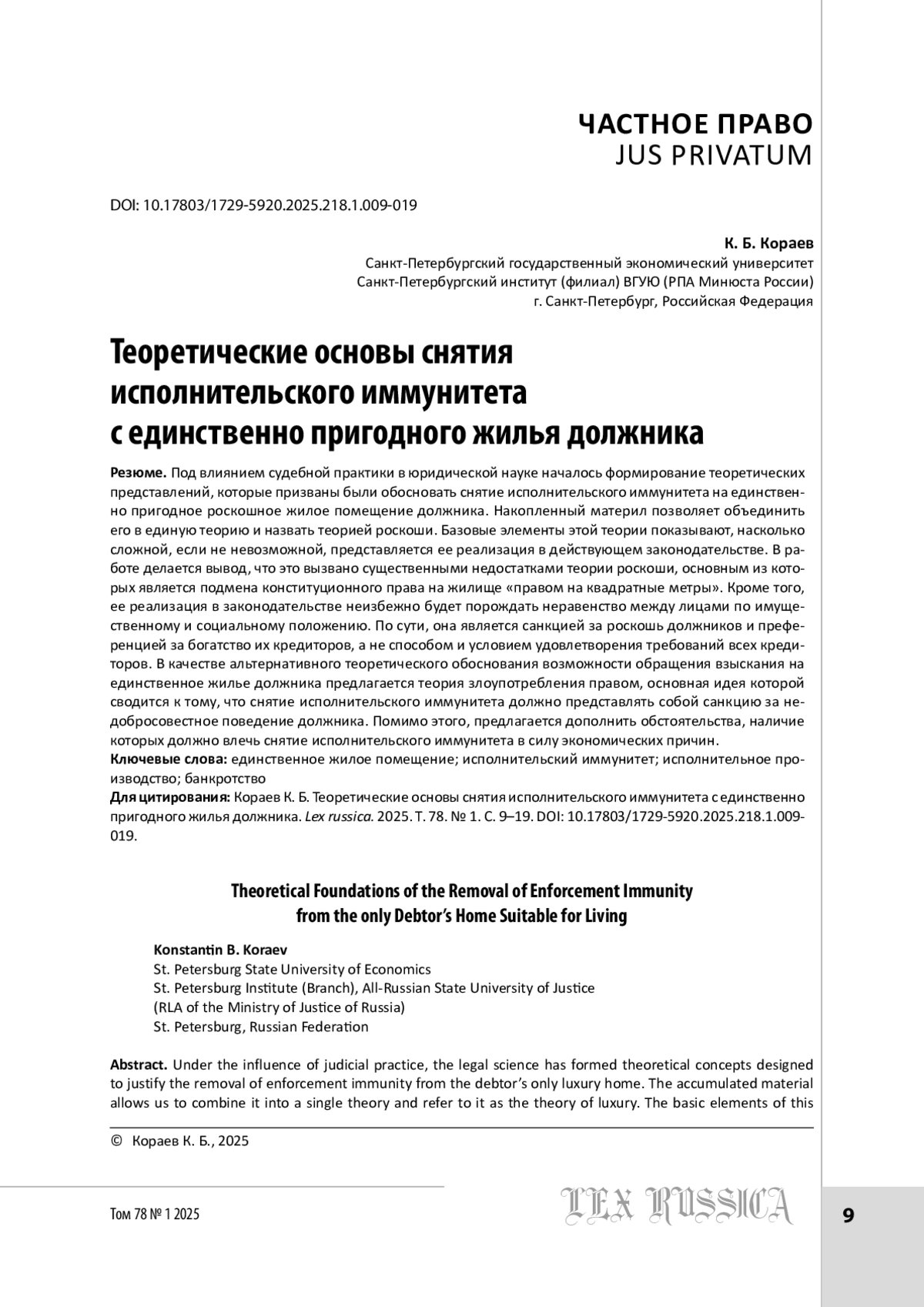Под влиянием судебной практики в юридической науке началось формирование теоретических представлений, которые призваны были обосновать снятие исполнительского иммунитета на единственно пригодное роскошное жилое помещение должника. Накопленный материл позволяет объединить его в единую теорию и назвать теорией роскоши. Базовые элементы этой теории показывают, насколько сложной, если не невозможной, представляется ее реализация в действующем законодательстве. В работе делается вывод, что это вызвано существенными недостатками теории роскоши, основным из которых является подмена конституционного права на жилище «правом на квадратные метры». Кроме того, ее реализация в законодательстве неизбежно будет порождать неравенство между лицами по имущественному и социальному положению. По сути, она является санкцией за роскошь должников и преференцией за богатство их кредиторов, а не способом и условием удовлетворения требований всех кредиторов. В качестве альтернативного теоретического обоснования возможности обращения взыскания на единственное жилье должника предлагается теория злоупотребления правом, основная идея которой сводится к тому, что снятие исполнительского иммунитета должно представлять собой санкцию за недобросовестное поведение должника. Помимо этого, предлагается дополнить обстоятельства, наличие которых должно влечь снятие исполнительского иммунитета в силу экономических причин.