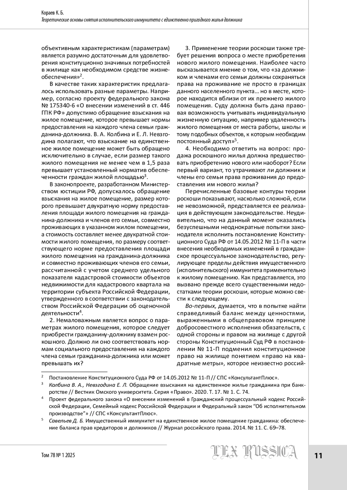 1. Бондарь Н. С. В поиске баланса конституционных ценностей: еще раз об обращении взыскания на жилые помещения граждан-должников // Цивилист. 2012. № 4. С. 50-57.