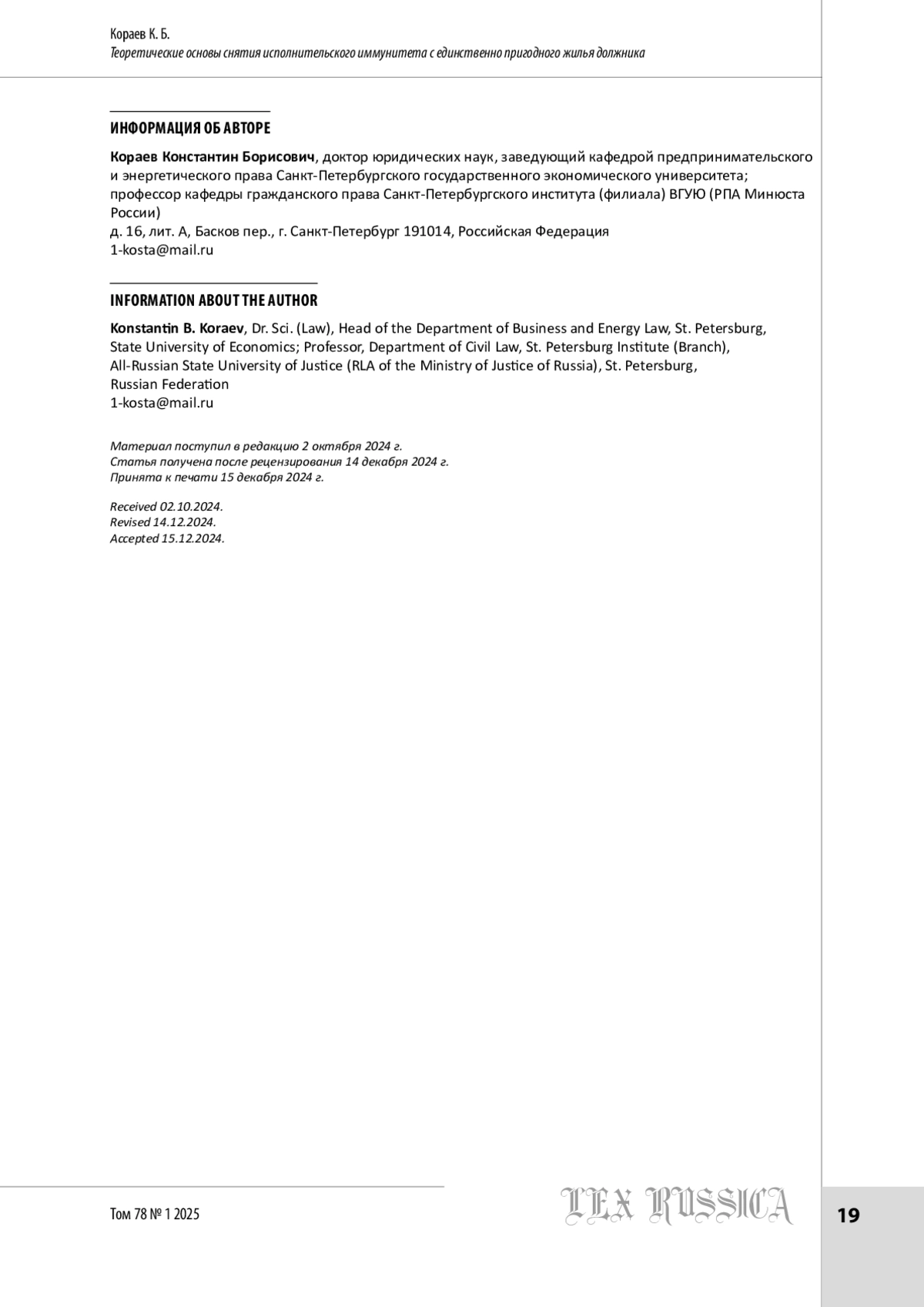 4. Савельев Д. Б. Имущественный иммунитет на единственное жилое помещение гражданина: обеспечение баланса прав кредиторов и должников // Журнал российского права. 2014. № 11. С. 69-78.