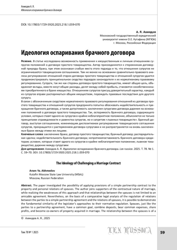 В статье исследована возможность применения к имущественным и личным отношениям супругов положений о договоре простого товарищества. Автор присоединяется к сторонникам договорной природы брака, при этом осознавая слабые места этого подхода и то, что отношения супругов не ограничиваются товарищеским соглашением. Тем не менее на основании сравнительно-правового анализа регулирования отношений сторон договора простого товарищества и отношений супругов удается продемонстрировать принципиальное сходство подходов законодателя к их нормативному правовому регулированию. Супруги, так же как стороны договора простого товарищества, имеют общую цель, объединяют вклады, вместе несут общие расходы, делят между собой прибыль, становятся сособственниками приобретенного в браке имущества. Отношениям супругов присущ доверительный характер, каждый из супругов вправе распоряжаться общим имуществом, порождать правовые последствия для другого супруга.