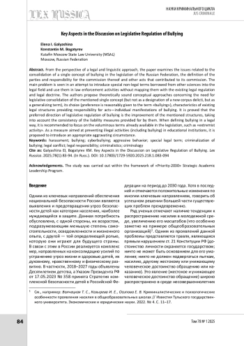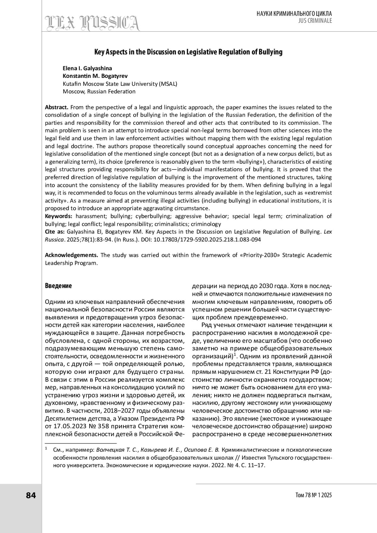 В статье с позиции юридико-лингвистического подхода рассматривается проблематика, связанная с закреплением в законодательстве Российской Федерации единого понятия травли (буллинга), определением субъектного состава и ответственности за совершение данного и иных, способствовавших его совершению деяний. Основная проблема усматривается в попытке внедрения в правовую материю и использования в правоприменительной деятельности заимствованных из других наук специальных неюридических терминов без их соотнесения с имеющимся правовым регулированием и юридической доктриной. Авторы предлагают теоретически обоснованные концептуальные подходы, касающиеся необходимости законодательного закрепления упомянутого единого понятия (но не в качестве обозначения нового состава преступления, а в качестве обобщающего термина), его выбора (предпочтение обоснованно отдается термину «травля»), характеристики существующих юридических составов, предусматривающих ответственность за деяния — отдельные проявления травли. Обосновывается, что предпочтительным направлением законодательного регулирования травли является совершенствование упомянутых составов с учетом системности предусмотренных ими мер ответственности. При юридическом определении травли рекомендуется ориентироваться на уже имеющиеся в законодательстве объемные категории, такие как «экстремистская деятельность». В качестве меры, направленной на превенцию противоправной деятельности (в том числе травли) в образовательных организациях, предлагается введение соответствующего отягчающего наказание обстоятельства.