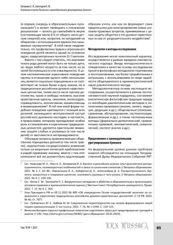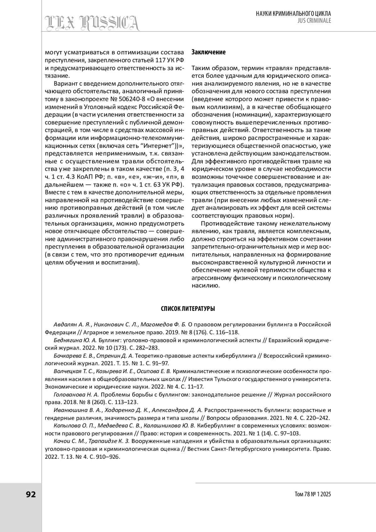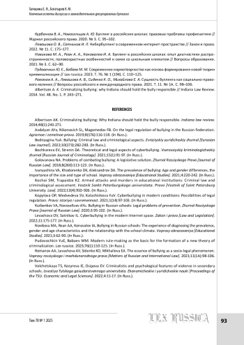 5. Голованова Н. А. Проблемы борьбы с буллингом: законодательное решение // Журнал российского права. 2018. № 8 (260). С. 113-123.