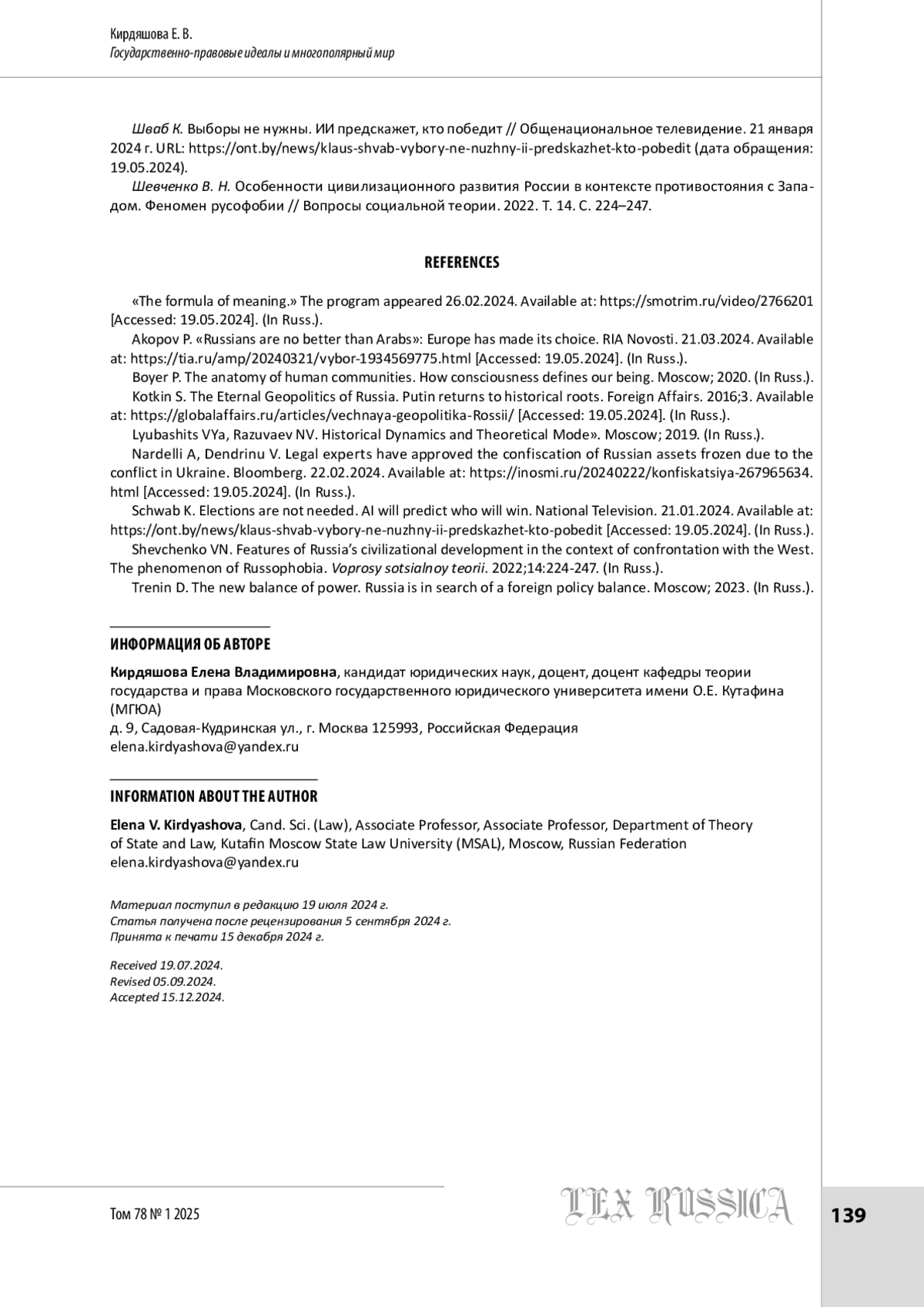 9. Шевченко В. Н. Особенности цивилизационного развития России в контексте противостояния с Западом. Феномен русофобии // Вопросы социальной теории. 2022. Т. 14. С. 224-247.
