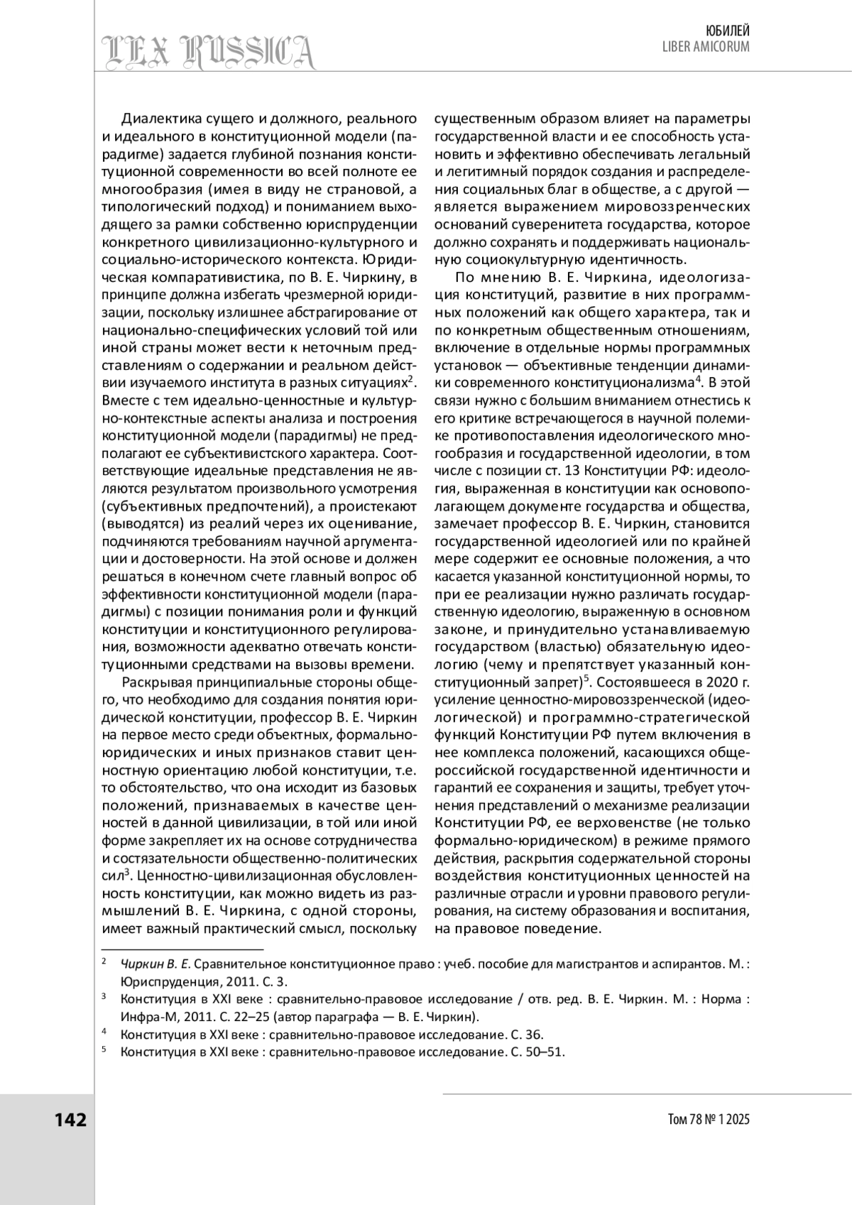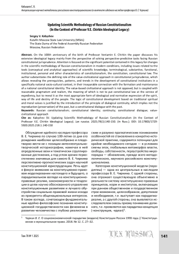 По случаю 100-летия со дня рождения профессора Вениамина Евгеньевича Чиркина в статье обсуждается его обширное идейное наследие, главным образом с позиции решения перспективно-прогностических задач, стоящих перед российской конституционной юриспруденцией. Внимание фокусируется на содержащемся в этом наследии значительном потенциале для обновления в современных условиях научной методологии отечественного конституционализма, включая вопросы, связанные с инструментарием (концептуально-аналитическими подходами) научного познания, терминологическими, предметными, функциональными, институционными, личностными и иными характеристиками конституционализма, конституции, конституционного права. Обосновывается определяющая роль ценностноцивилизационного подхода в конституционной юриспруденции, позволяющего раскрыть предпосылки, закономерности, тенденции развития конституционных институтов в специфически национальном социокультурном контексте, в их неразрывной связи с формированием и обеспечением общенациональной конституционной идентичности. Ценностно-цивилизационный подход не противопоставляется, а сопрягается с разумным прагматизмом и реализмом, смысл которых — не поставить конституционное право на службу целесообразности, а раскрыть его как наиболее целесообразную форму идейно-нормативного выражения духа, быта и судьбы народа. Логика основанного на традиционных духовно-нравственных ценностях конституционного развития обусловливается введением принципа диалогической преемственности, который подразумевает не воспроизведение (консервацию) прошлого, а конституционный диалог с прошлым.