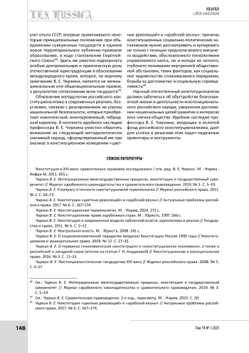 4. Чиркин В. Е. Конституции «цветных революций» и «арабской весны» // Актуальные проблемы российского права. 2017. № 6. С. 167-174.