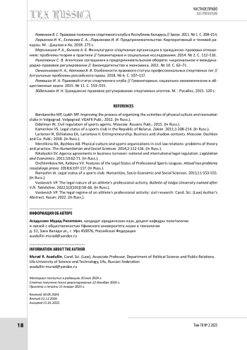 3. Васькевич В. П. Правовой режим профессиональной деятельности спортсмена: цивилистическое исследование : автореф. дис. … д-ра юрид. наук. Казань, 2022. 65 с.