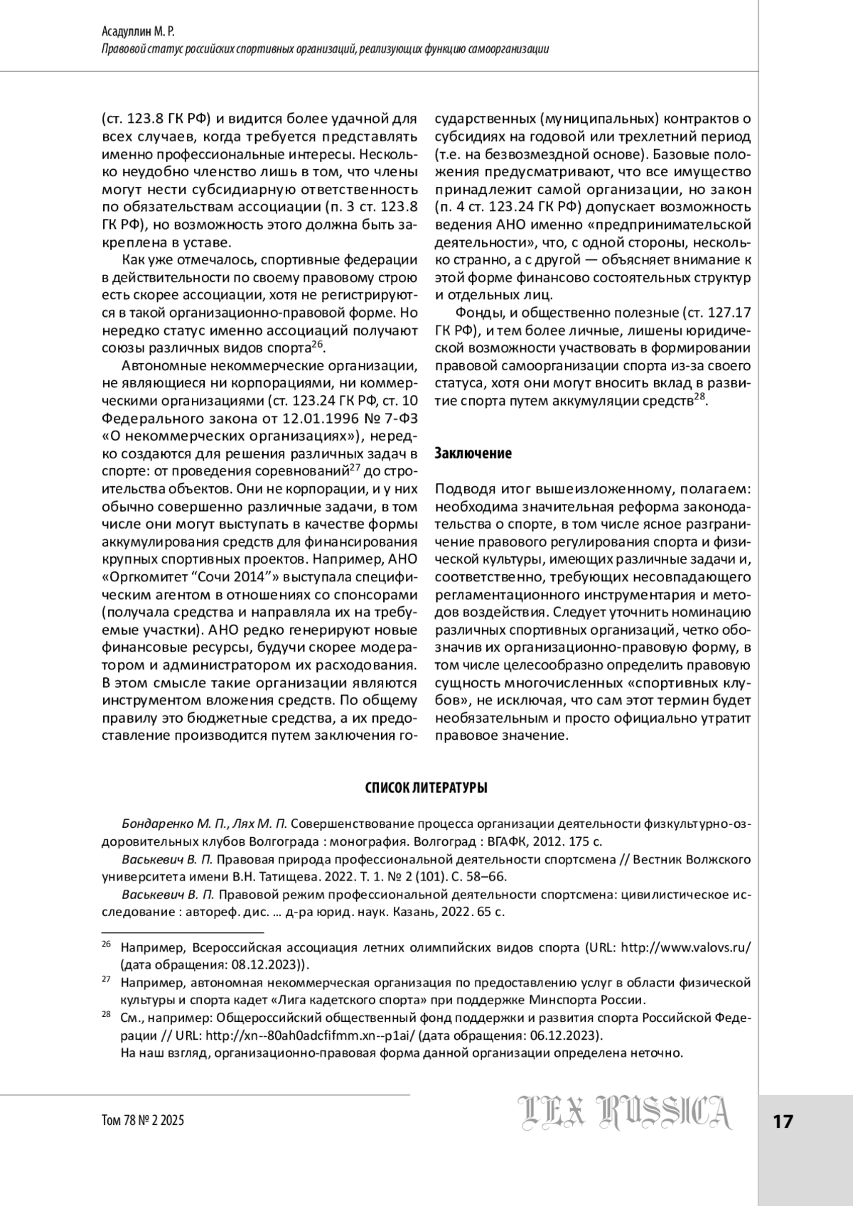 2. Васькевич В. П. Правовая природа профессиональной деятельности спортсмена // Вестник Волжского университета имени В.Н. Татищева. 2022. Т. 1. № 2 (101). С. 58-66.