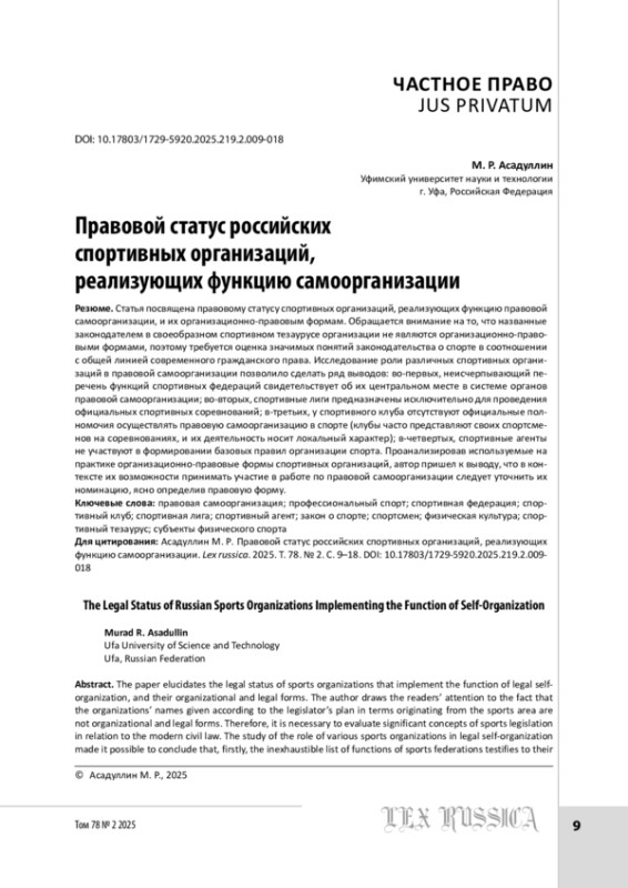 Статья посвящена правовому статусу спортивных организаций, реализующих функцию правовой самоорганизации, и их организационно-правовым формам. Обращается внимание на то, что названные законодателем в своеобразном спортивном тезаурусе организации не являются организационно-правовыми формами, поэтому требуется оценка значимых понятий законодательства о спорте в соотношении с общей линией современного гражданского права. Исследование роли различных спортивных организаций в правовой самоорганизации позволило сделать ряд выводов: во-первых, неисчерпывающий перечень функций спортивных федераций свидетельствует об их центральном месте в системе органов правовой самоорганизации; во-вторых, спортивные лиги предназначены исключительно для проведения официальных спортивных соревнований; в-третьих, у спортивного клуба отсутствуют официальные полномочия осуществлять правовую самоорганизацию в спорте (клубы часто представляют своих спортсменов на соревнованиях, и их деятельность носит локальный характер); в-четвертых, спортивные агенты не участвуют в формировании базовых правил организации спорта. Проанализировав используемые на практике организационно-правовые формы спортивных организаций, автор пришел к выводу, что в контексте их возможности принимать участие в работе по правовой самоорганизации следует уточнить их номинацию, ясно определив правовую форму.