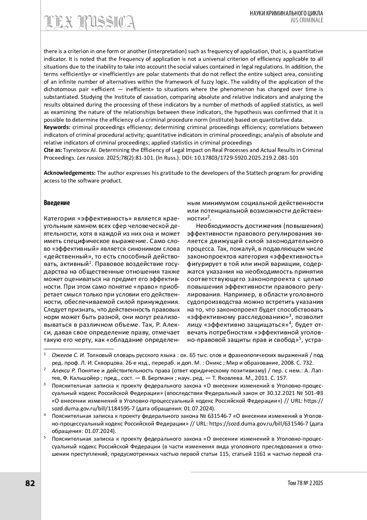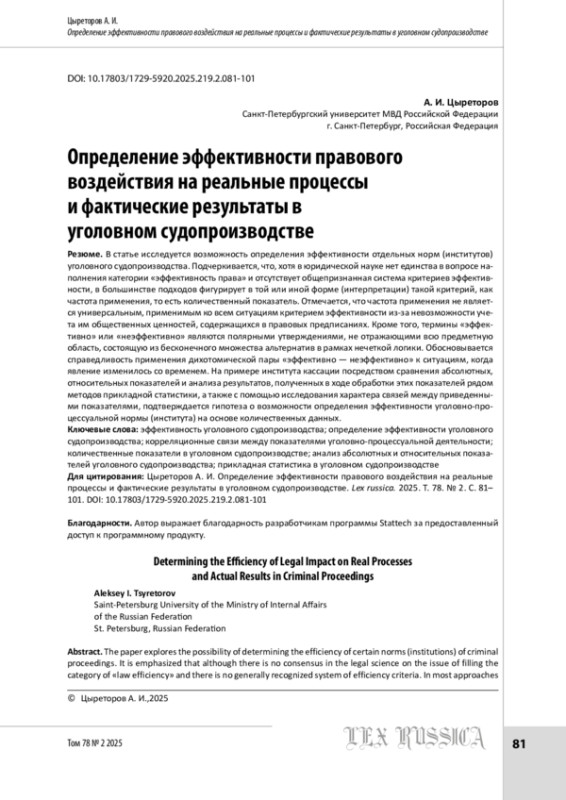 В статье исследуется возможность определения эффективности отдельных норм (институтов) уголовного судопроизводства. Подчеркивается, что, хотя в юридической науке нет единства в вопросе наполнения категории «эффективность права» и отсутствует общепризнанная система критериев эффективности, в большинстве подходов фигурирует в той или иной форме (интерпретации) такой критерий, как частота применения, то есть количественный показатель. Отмечается, что частота применения не является универсальным, применимым ко всем ситуациям критерием эффективности из-за невозможности учета им общественных ценностей, содержащихся в правовых предписаниях. Кроме того, термины «эффективно» или «неэффективно» являются полярными утверждениями, не отражающими всю предметную область, состоящую из бесконечного множества альтернатив в рамках нечеткой логики. Обосновывается справедливость применения дихотомической пары «эффективно — неэффективно» к ситуациям, когда явление изменилось со временем. На примере института кассации посредством сравнения абсолютных, относительных показателей и анализа результатов, полученных в ходе обработки этих показателей рядом методов прикладной статистики, а также с помощью исследования характера связей между приведенными показателями, подтверждается гипотеза о возможности определения эффективности уголовно-процессуальной нормы (института) на основе количественных данных.