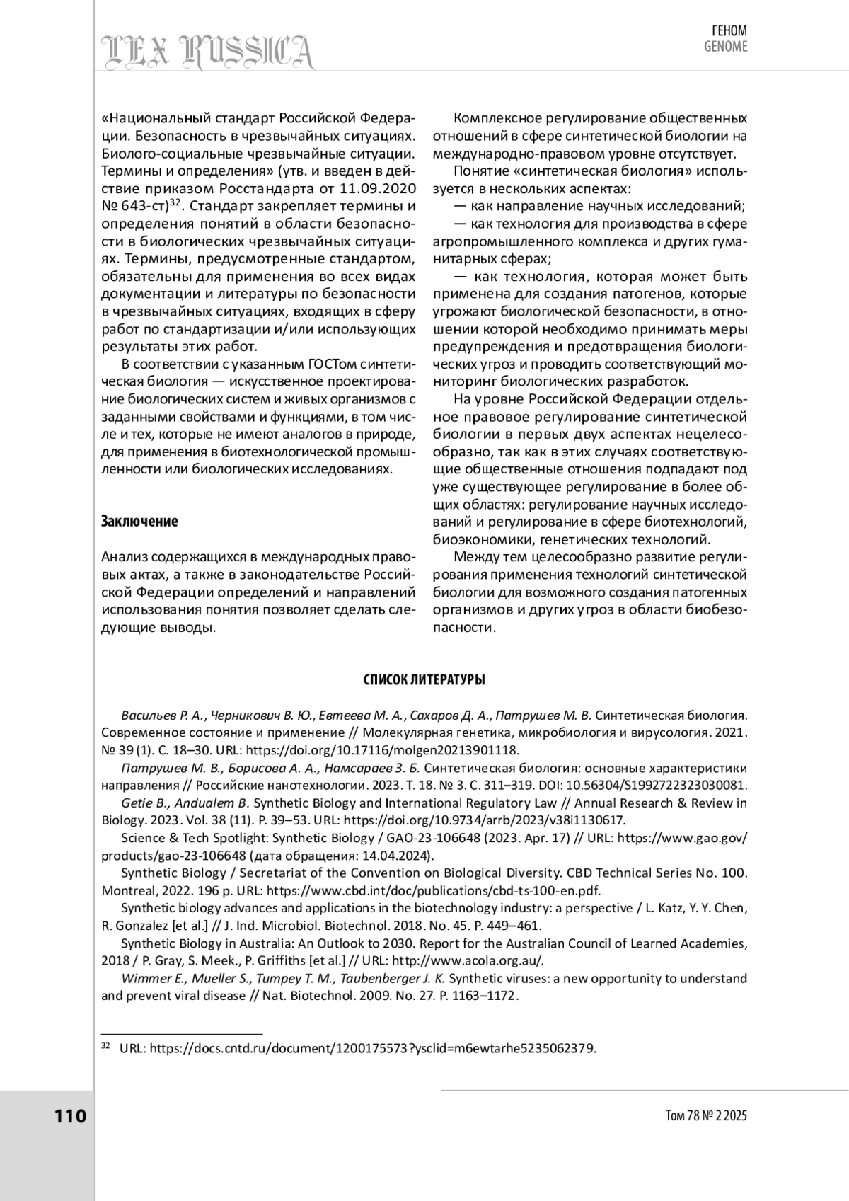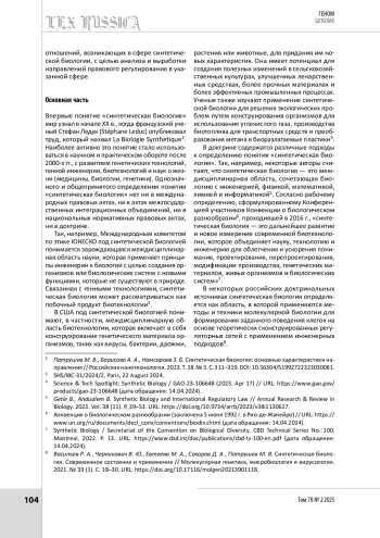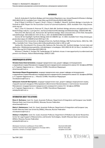 3. Getie B., Andualem B. Synthetic Biology and International Regulatory Law // Annual Research & Review in Biology. 2023. Vol. 38 (11). P. 39-53. URL: https://doi.org/10.9734/arrb/2023/v38i1130617.