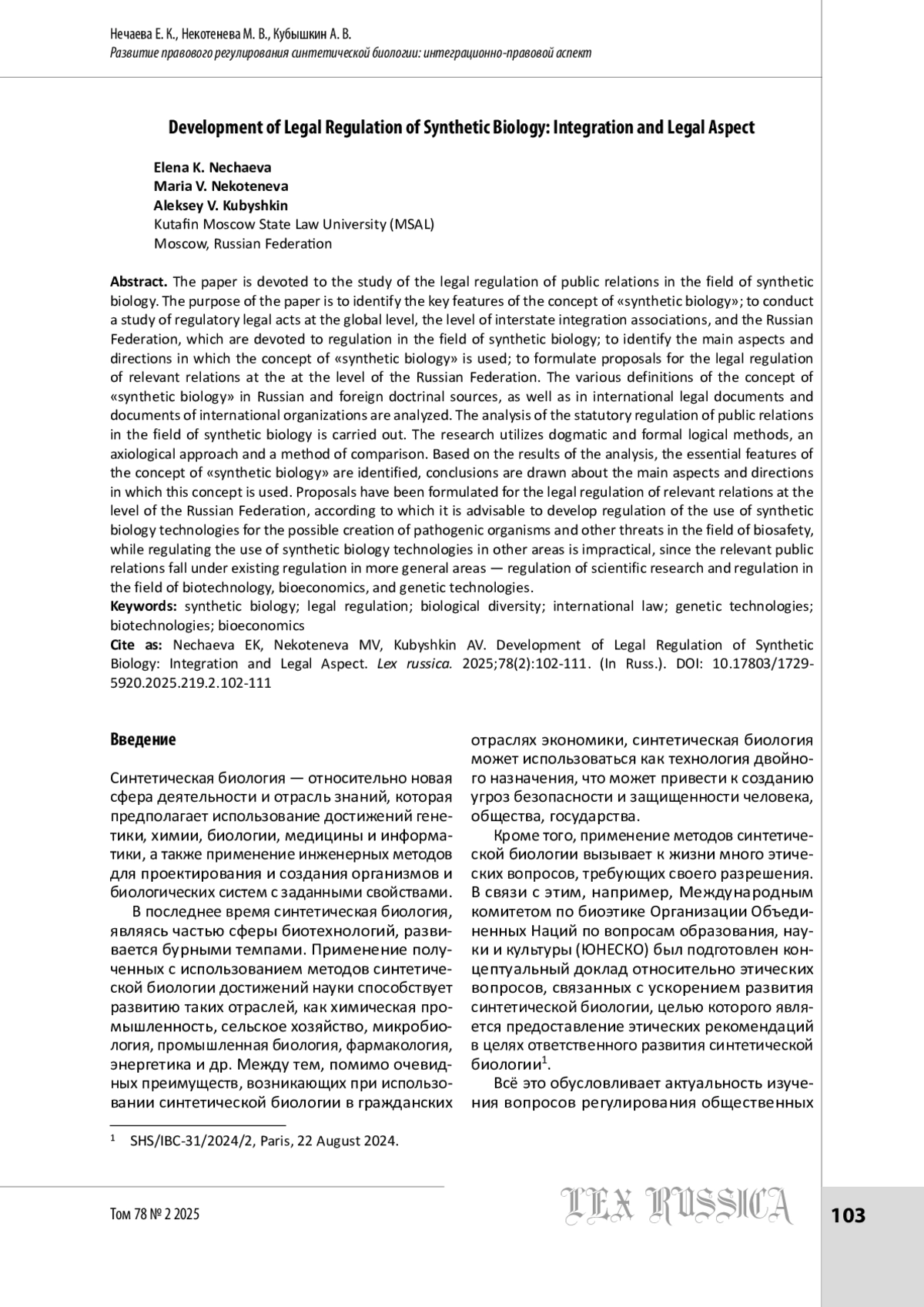 Статья посвящена исследованию правового регулирования общественных отношений в сфере синтетической биологии. Цель статьи — выявить ключевые признаки понятия «синтетическая биология»; провести исследование нормативных правовых актов на глобальном уровне, уровне межгосударственных интеграционных объединений Российской Федерации, которые посвящены регулированию в сфере синтетической биологии; выявить основные аспекты и направления, в которых используется понятие «синтетическая биология»; сформулировать предложения по правовому регулированию соответствующих отношений на уровне Российской Федерации. Проанализированы различные определения понятия «синтетическая биология» в российских и зарубежных доктринальных источниках, а также в международно-правовых документах и документах международных организаций. Проведен анализ нормативного регулирования общественных отношений в сфере синтетической биологии. При исследовании использовались догматический и формально-логический методы, аксиологический подход и метод сравнения. По итогам анализа выделены существенные признаки понятия «синтетическая биология», сделаны выводы об основных аспектах и направлениях, в рамках которых используется данное понятие. Сформулированы предложения по правовому регулированию соответствующих отношений на уровне Российской Федерации, согласно которым целесообразно развивать регулирование применения технологий синтетической биологии для возможного создания патогенных организмов и других угроз в области биобезопасности, при этом регулировать применение технологий синтетической биологии в рамках других направлений нецелесообразно, поскольку соответствующие общественные отношения подпадают под уже существующее регулирование в более общих областях, таких как регулирование научных исследований и регулирование в сфере биотехнологий, биоэкономики, генетических технологий.