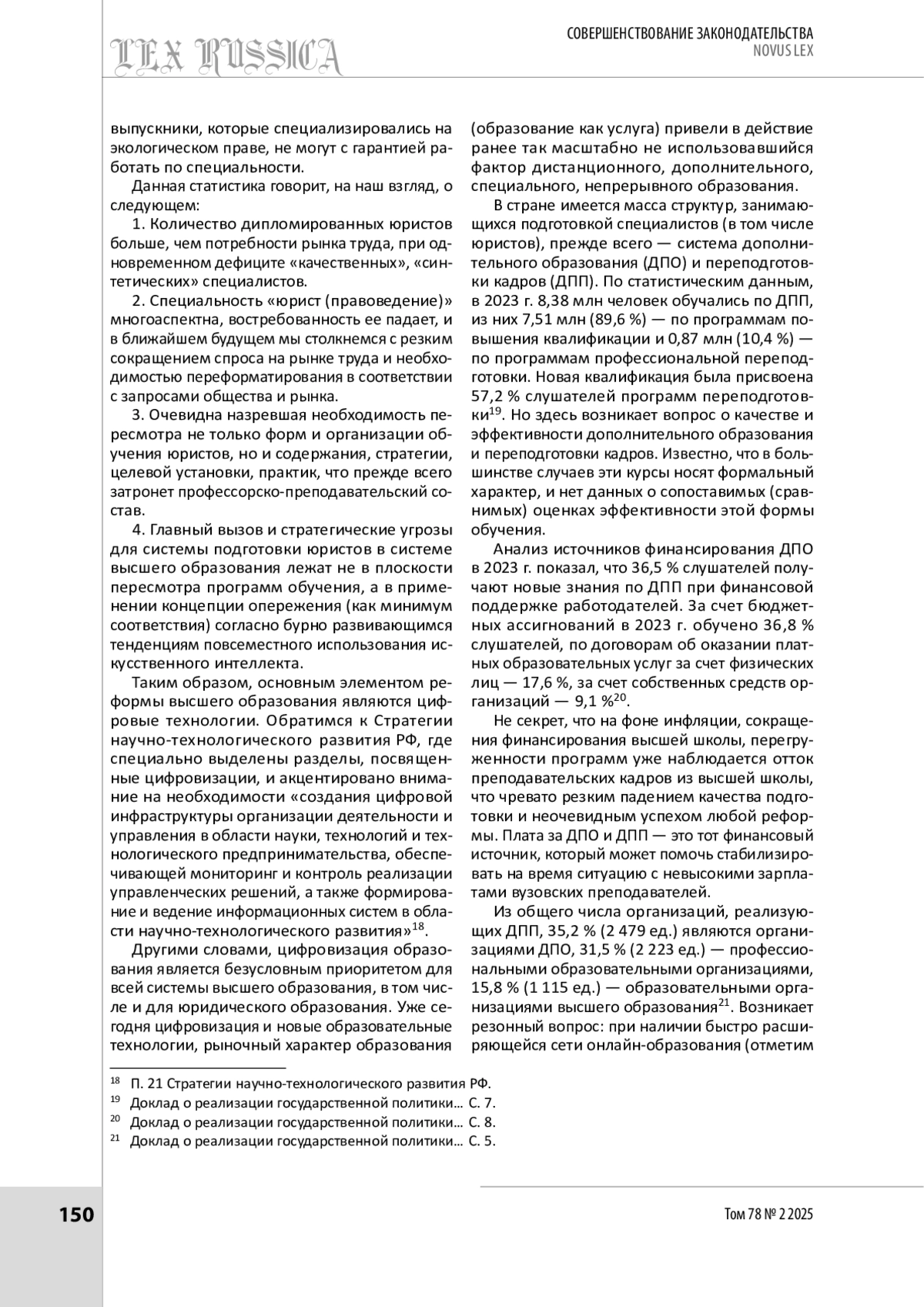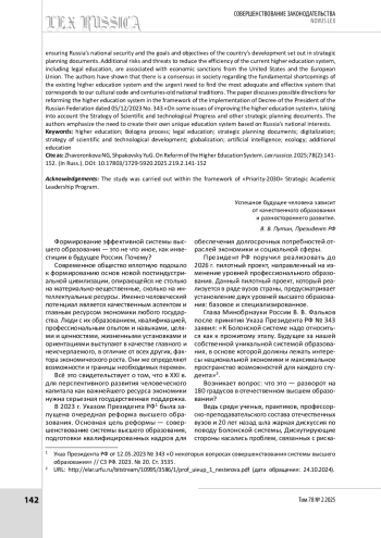 В настоящее время государство ориентируется на инновационный путь развития. Существующая система высшего образования, построенная по принципам Болонского процесса, вошла в противоречие с современными требованиями к обеспечению национальной безопасности России, целями и задачами развития страны, изложенными в документах стратегического планирования. Дополнительные риски и угрозы снижения эффективности действующей системы высшего образования, в том числе и юридического, связаны с экономическими санкциями со стороны США и Европейского Союза. Авторы показывают, что в обществе есть консенсус относительно принципиальных недостатков существующей системы высшего образования и острая потребность в нахождении наиболее адекватной и эффективной системы, соответствующей нашему культурному коду и многовековым национальным традициям. В статье рассматриваются возможные направления реформирования системы высшего образования в рамках реализации Указа Президента РФ от 12.05.2023 № 343 «О некоторых вопросах совершенствования системы высшего образования» с учетом Стратегии научно-технологического прогресса, других документов стратегического планирования. Авторы делают акцент на необходимости создания собственной уникальной системы образования, основанной на национальных интересах России.