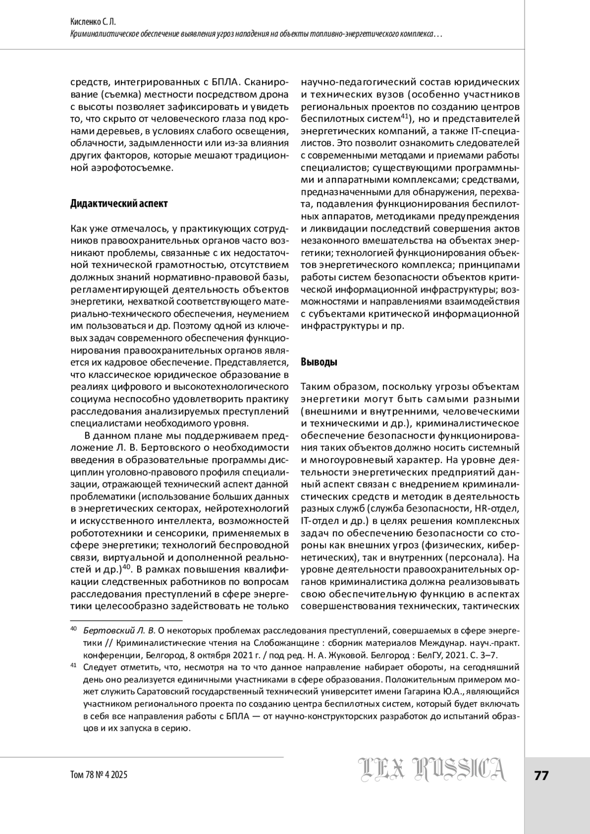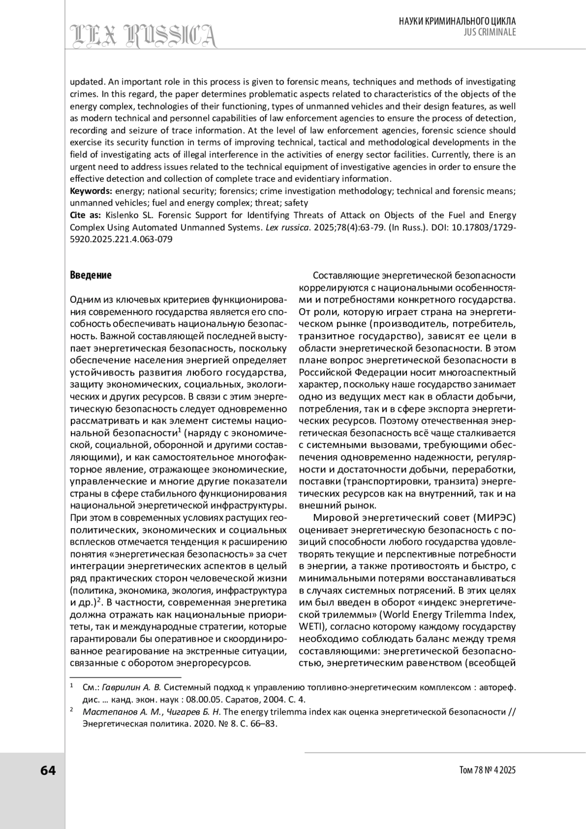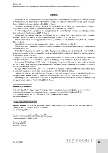 Энергетические системы всех стран мира в условиях вооруженных конфликтов всё чаще подвергаются не только кибератакам, но и внешним физическим атакам, в том числе с использованием передовых технологий (например, беспилотных аппаратов). Поскольку от функционирования таких систем зависит национальная безопасность страны, актуализируются вопросы своевременного пресечения подобных атак и выявления лиц, их осуществляющих. Немаловажная роль в данном процессе отводится криминалистическим средствам, приемам и методам расследования преступлений. В этом направлении выделяются проблемные аспекты, связанные с характеристиками объектов энергетического комплекса, технологиями их функционирования, типами беспилотных аппаратов и их конструктивными особенностями, а также современными техническими и кадровыми возможностями правоохранительных органов по обеспечению процесса обнаружения, фиксации и изъятия следовой информации. На уровне деятельности правоохранительных органов криминалистика должна реализовывать свою обеспечительную функцию в аспектах совершенствования технических, тактических и методических разработок в области расследования актов незаконного вмешательства в деятельность объектов энергетического сектора. Настоятельно требуют решения вопросы, связанные с технической оснащенностью следственных органов в целях эффективного выявления и сбора полной следовой и доказательственной информации.