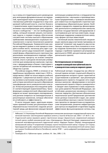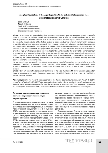 Создание сети современных университетских кампусов международного уровня требует разработки универсальной организационно-правовой модели. По мнению авторов, эффективная модель должна учитывать как публичный интерес, так и интересы всех заинтересованных сторон — участников таких кампусов. Авторы приходят к заключению, что успешная реализация федерального проекта по созданию сети университетских кампусов международного уровня возможна только при комплексном подходе, включающем институциональную, ценностную и идеологическую составляющие. Сравнение зарубежного и отечественного опыта позволяет утверждать, что российская модель должна учитывать специфику национального контекста. В работе предложен системный анализ различных моделей правового регулирования, на базе нескольких правовых критериев приводится типология кампусов и оценивается состоятельность авторской концепции в ее сравнении с подходами в мировой практике. Значительное внимание в работе уделено юридической оценке отдельных проявлений инклюзии в образовательной среде. Квинтэссенцией работы является идея о необходимости и своевременности разработки универсальной модели регулирования деятельности университетских кампусов, обеспечивающей баланс между автономией и подотчетностью.