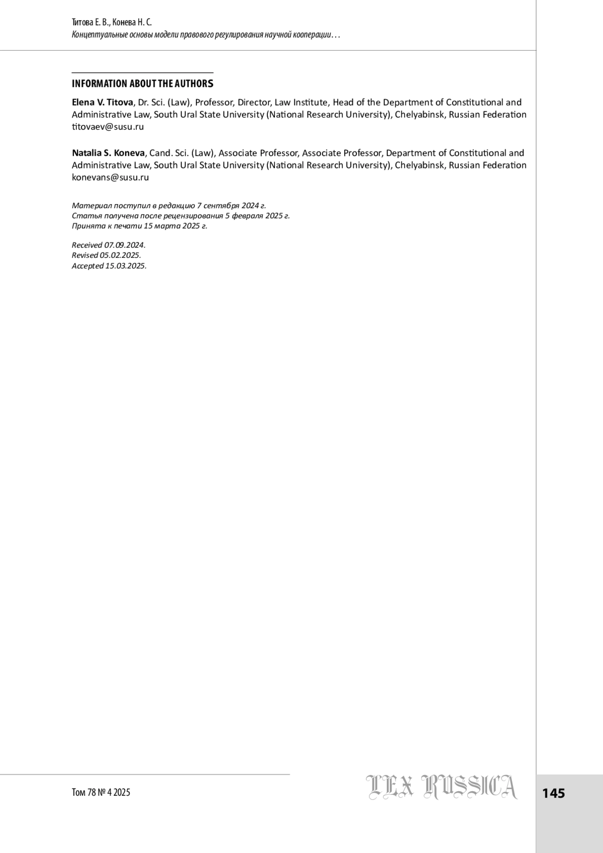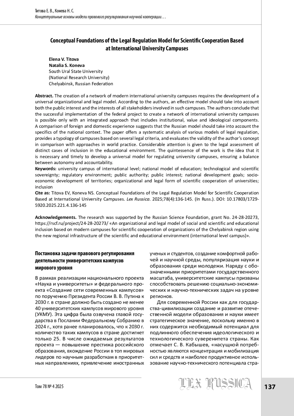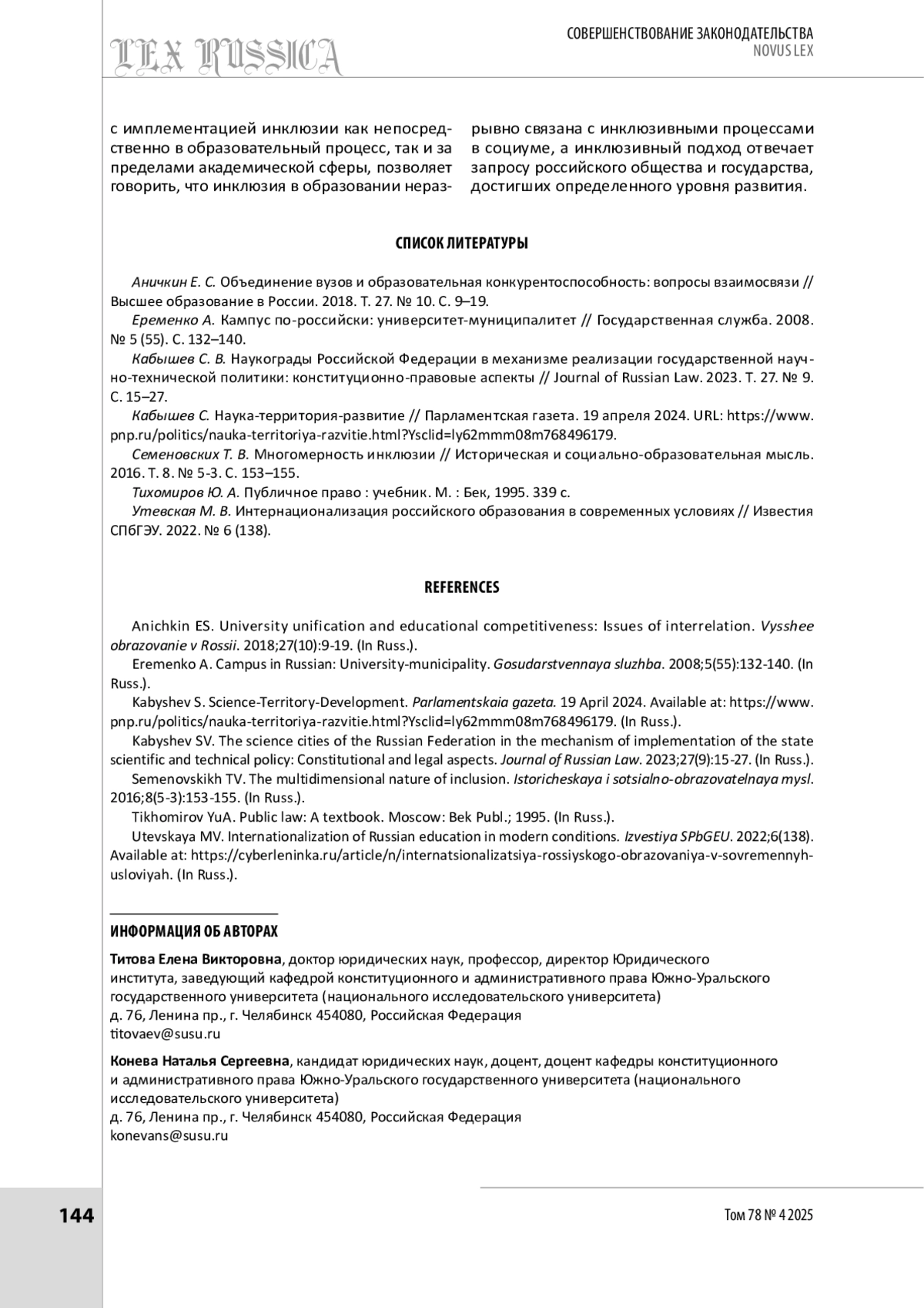 3. Кабышев С. В. Наукограды Российской Федерации в механизме реализации государственной научно-технической политики: конституционно-правовые аспекты // Journal of Russian Law. 2023. Т. 27. № 9. С. 15-27.