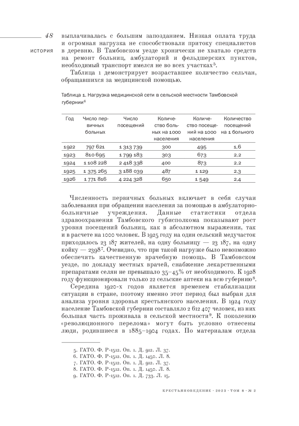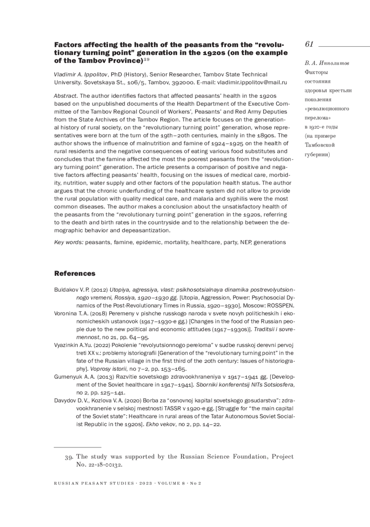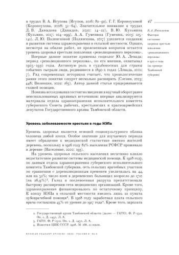 The author identifies factors that affected peasants’ health in the 1920s based on the unpublished documents of the Health Department of the Executive Committee of the Tambov Regional Council of Workers’, Peasants’ and Red Army Deputies from the State Archives of the Tambov Region. The article focuses on the generational history of rural society, on the “revolutionary turning point” generation, whose representatives were born at the turn of the 19th-20th centuries, mainly in the 1890s. The author shows the influence of malnutrition and famine of 1924-1925 on the health of rural residents and the negative consequences of eating various food substitutes and concludes that the famine affected the most the poorest peasants from the “revolutionary turning point” generation. The article presents a comparison of positive and negative factors affecting peasants’ health, focusing on the issues of medical care, morbidity, nutrition, water supply and other factors of the population health status. The author argues that the chronic underfunding of the healthcare system did not allow to provide the rural population with quality medical care, and malaria and syphilis were the most common diseases. The author makes a conclusion about the unsatisfactory health of the peasants from the “revolutionary turning point” generation in the 1920s, referring to the death and birth rates in the countryside and to the relationship between the demographic behavior and depeasantization.