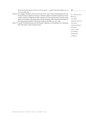 3. 	Вязинкин А. Ю. (2022). Поколение “революционного перелома” в судьбе русской деревни первой трети XX в.: проблемы историографии // Вопросы истории. № 7-2. С. 153-165.  EDN: IPECND