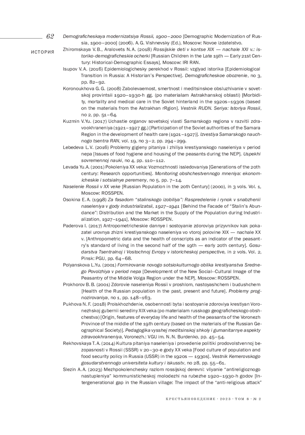 8. 	Исупов В. А. (2016). Эпидемиологический переход в России: взгляд историка // Демографическое обозрение. Т. 3. № 4. С. 82-92.  EDN: YNVXRL