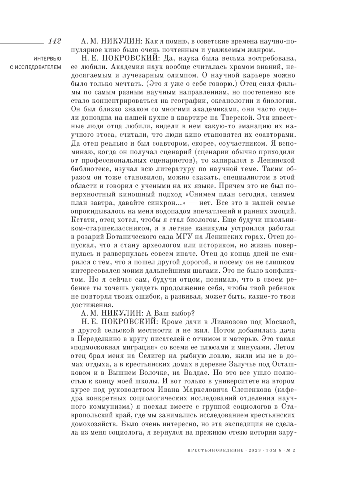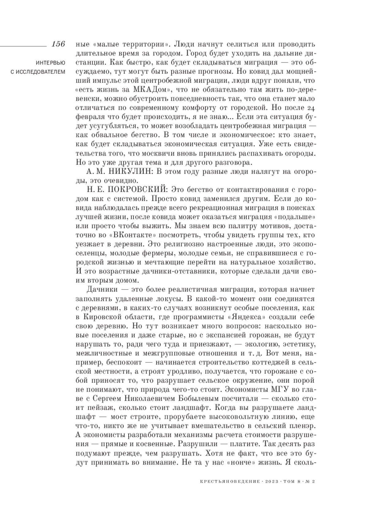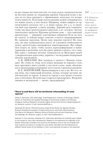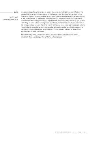 В интервью профессора НИУ ВШЭ Н. Е. Покровского обсуждается его путь в науку, связанную с проблематикой сельско-городского развития. Отталкиваясь от собственного опыта изначально городского жителя, Покровский размышляет, как и почему горожане приходят в деревню со своими проектами и планами проживания и обустройства окружающей действительности. В интервью рассматриваются жизненные траектории разных социальных страт горожан в их сельских поисках. При этом даются сущностные характеристики динамики сельских изменений последних десятилетий, в том числе на основе личного опыта Покровского, связанного с многолетней работой Угорского проекта сельского развития в Костромской области. Как социолог-американист Покровский обращается в своих размышлениях и к американским корням сельского образа жизни, связанным с идеями Т. Джефферсона и Г. Торо, а также своим личным впечатлениям от работы и проживания в сельских регионах США. Большое внимание в интервью уделяется вопросам пространственного переосмысления сельско-городского развития, связанных, с одной стороны, с критикой современного образа жизни в крупных городах, а с другой - с новыми направлениями не только экономических и технологических, но также культурно-исторических и рекреационно-экологических практик в сельской местности. В заключение ставится вопрос о возможности нового картографирования сельских пространств с целью комплексной оценки развития локальных территорий.