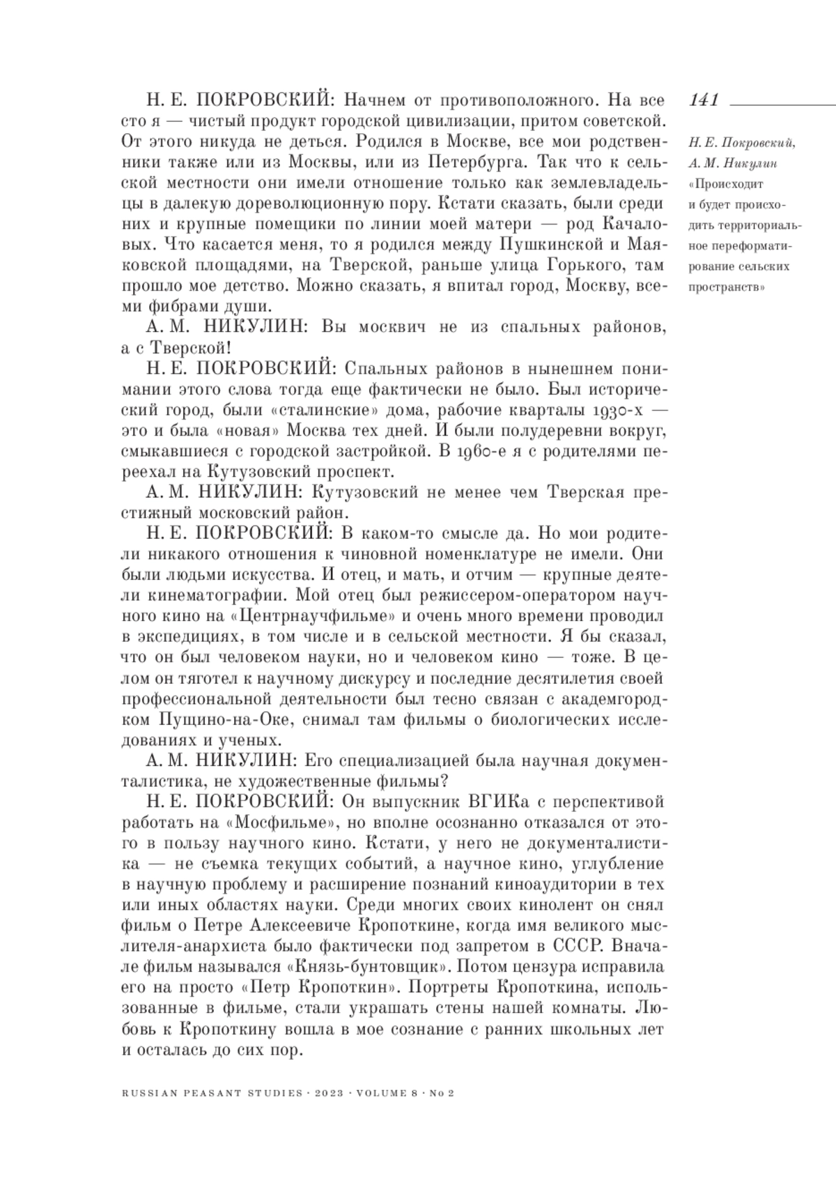 In the interview, Professor N. E. Pokrovsky describes his scientific path related to the issues of rural-urban development. Based on his experience as originally a city dweller, Pokrovsky considers how and why city-dwellers move to the countryside with their projects and plans to change the rural reality; identifies the life trajectories of different social strata of city dwellers in their rural searches; focuses on the essential characteristics of rural changes in recent decades, including those identified on the basis of his long-term observations in the Ugorsk rural development project in the Kostroma Region. As a sociologist-Americanist, Pokrovsky refers to the American roots of the rural lifestyle - ideas of T. Jefferson and H. Thoreau - and to his personal impressions of rural regions of the United States. Pokrovsky also mentions the spatial rethinking of rural-urban development as related, on the one hand, to the criticism of life in large cities, and, on the other hand, to the new economic-technological, culturalhistorical and recreational-environmental practices in rural areas. In conclusion, he considers the possibility of a new mapping of rural spaces in order to assess the development of local territories.