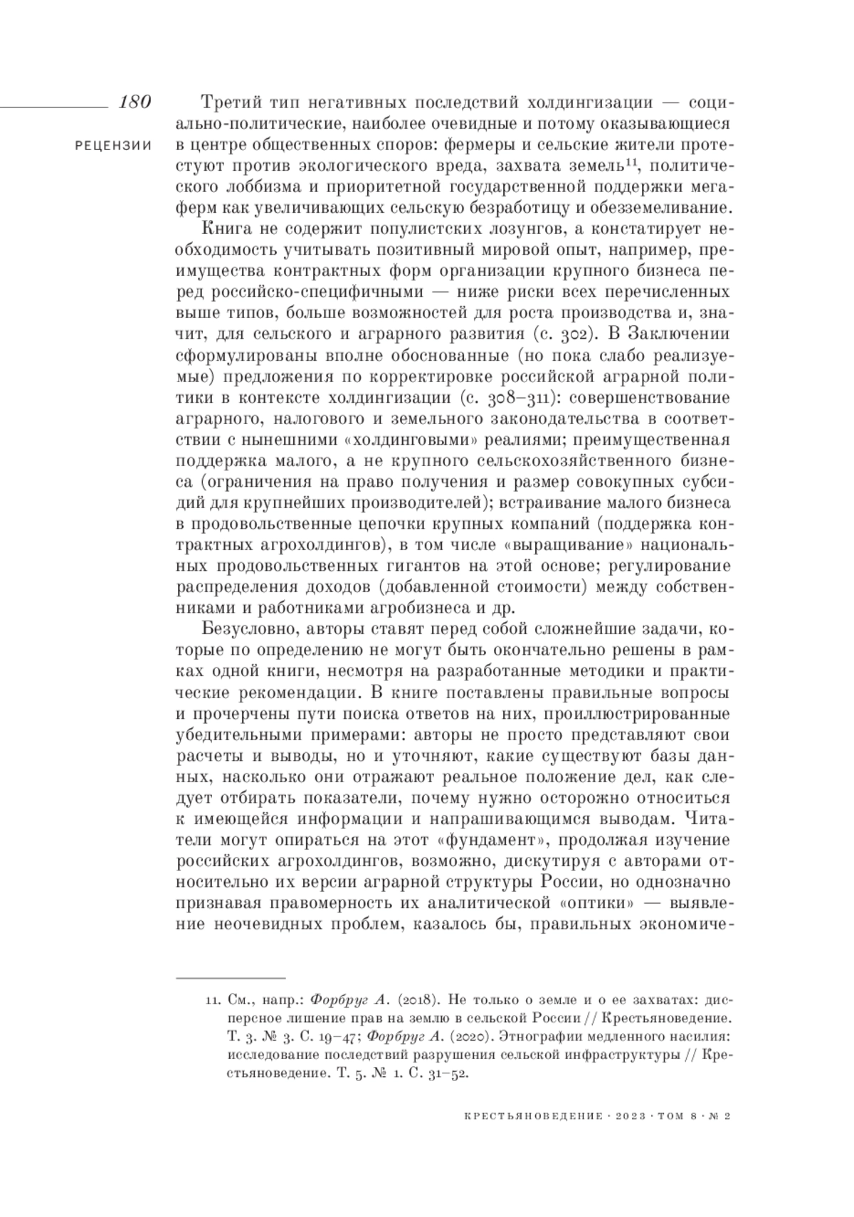 11. 	Форбруг А. (2018). Не только о земле и о ее захватах: дисперсное лишение прав на землю в сельской России // Крестьяноведение. Т. 3. № 3. С. 19-47.  EDN: YMMJZB