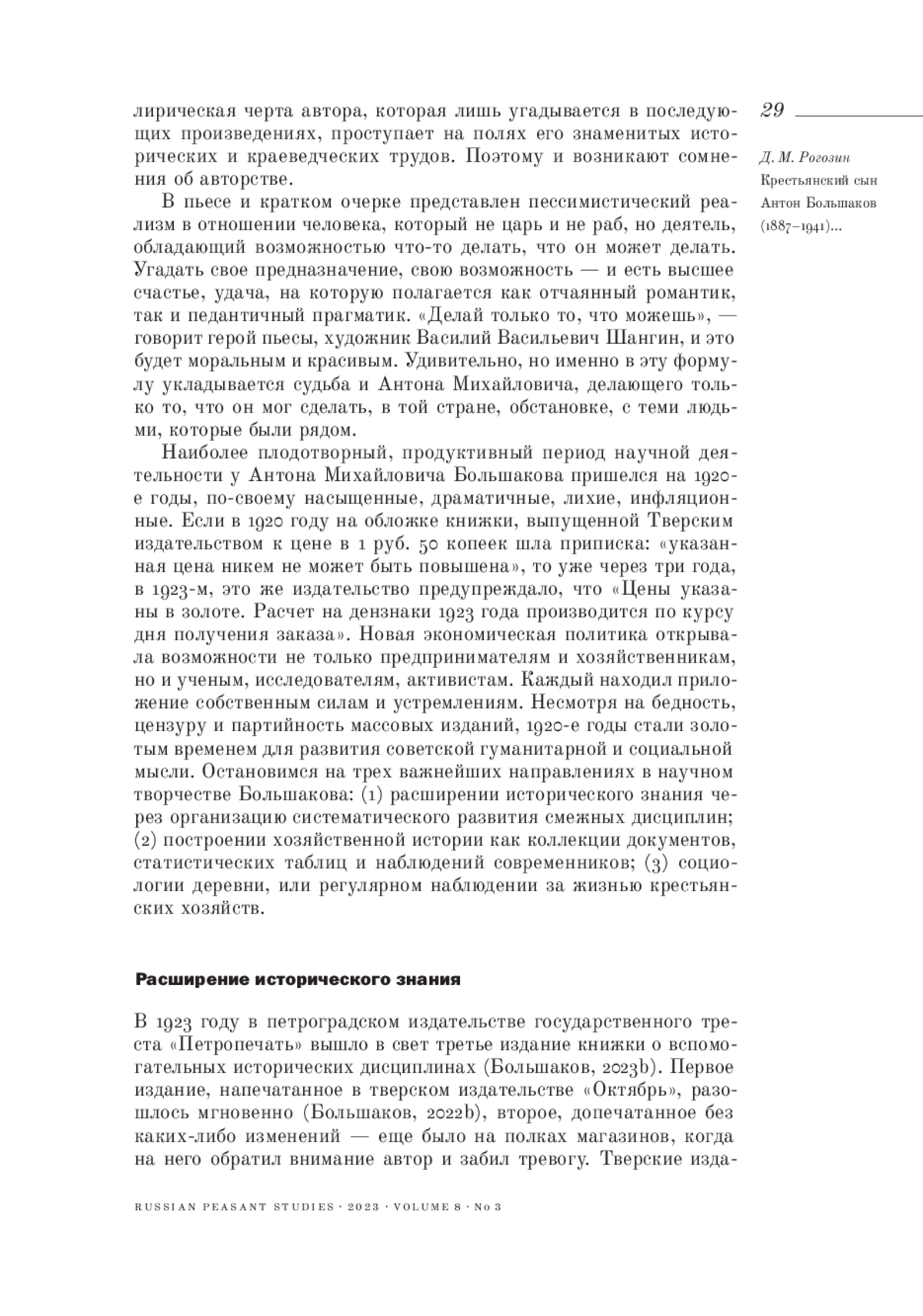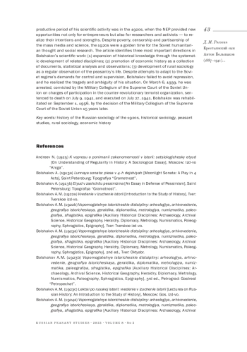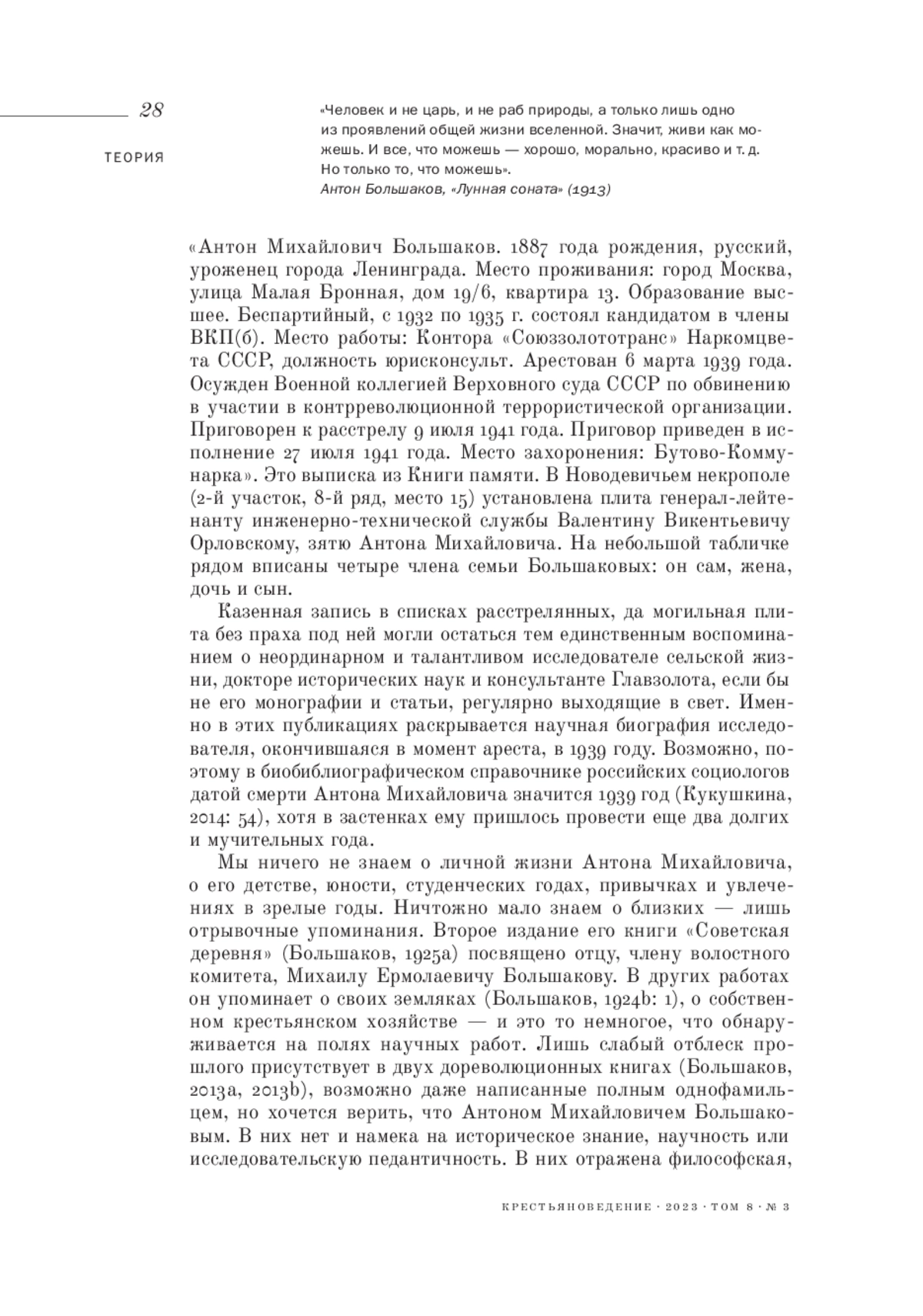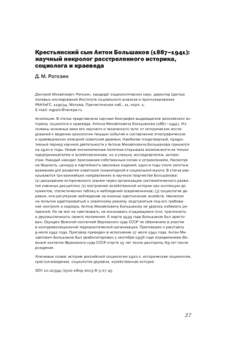 В статье представлена научная биография выдающегося российского историка, социолога и краеведа, Антона Михайловича Большакова (1887-1941). Изложены основные вехи его научного и творческого пути: от исторических исследований к ведению хронологии текущих событий и составлению этнографических и краеведческих описаний советской деревни. Наиболее плодотворный, продуктивный период научной деятельности у Антона Михайловича Большакова пришелся на 1920-е годы. Новая экономическая политика открывала возможности не только предпринимателям и хозяйственникам, но и ученым, исследователям, активистам. Каждый находил приложение собственным силам и устремлениям. Несмотря на бедность, цензуру и партийность массовых изданий, 1920-е годы стали золотым временем для развития советской гуманитарной и социальной мысли. В статье раскрываются три важнейших направлениях в научном творчестве Большакова: (1) расширение исторического знания через организацию систематического развития смежных дисциплин; (2) построение хозяйственной истории как коллекции документов, статистических таблиц и наблюдений современников; (3) социология деревни, или регулярное наблюдение за жизнью крестьянских хозяйств. Несмотря на попытки адаптироваться к советскому режиму, подстроиться под его требования контроля и надзора, Антону Михайловичу Большакову не удалось избежать репрессий. Он не мог не чувствовать, не осознавать сгущающиеся тучи, трагичность и двусмысленность своего положения. 6 марта 1939 года Большаков был арестован. Осужден Военной коллегией Верховного суда СССР по обвинению в участии в контрреволюционной террористической организации. Приговорен к расстрелу 9 июля 1941 года. Приговор приведен в исполнение 27 июля 1941 года. Антон Михайлович Большаков был реабилитирован 1 сентября 1956 года определением Военной коллегии Верховного суда СССР, спустя 15 лет после расстрела, 69 лет после рождения.