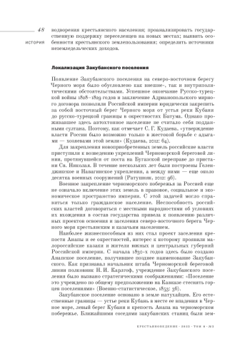 Статья посвящена анализу переселения крестьян на северо-восточный берег Черного моря для освоения южных окраин Российской империи в первой половине XIX века. Основная цель - изучение особенностей обустройства крестьян в станицах Закубанского поселения в 1830-1850-х годах и их адаптации к местным условиям. В результате проведенного исследования установлено, что в Закубанском поселении властями был создан особый поселенческий тип - неказачьи станицы, населенные крестьянами из южных и центральных губерний и утратившими навыки военного дела малороссийскими казаками. Крестьянам здесь пришлось столкнуться с недостатком мест для водворения, ограниченным земельным фондом, нападениями со стороны горцев, участием в строительной деятельности для возведения новых населенных пунктов. Правительство оказывало им помощь в форме выдачи сельскохозяйственного инвентаря, оружия, денежных пособий, продовольствия и привлечения к несельскохозяйственным заработкам. После окончательного водворения в одной из неказачьих станиц в распоряжение крестьянам передавались огороды, пашни и сенокосы. Однако землепользование и хозяйство строго регламентировалось станичными властями в связи с постоянной военной опасностью.