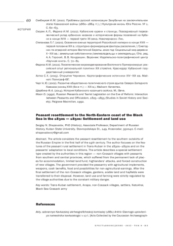 15. 	Скибицкая И. М. (2010). Проблемы русской колонизации Закубанья на заключительном этапе Кавказской войны (1860-1864 гг.) // Культурная жизнь Юга России. № 1. С. 60-63.  EDN: NPSUXF