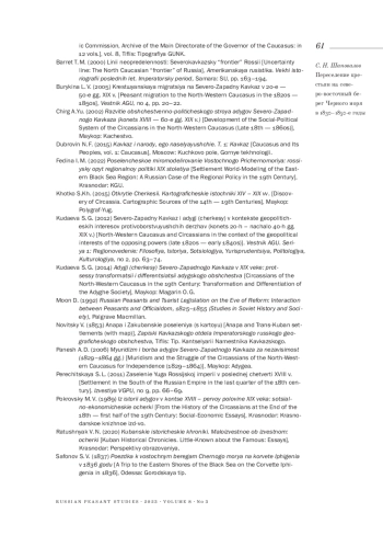 2. 	Баррет Т. М. (2000). Линии неопределенности: Северокавказский “фронтир” России // Американская русистика. Вехи историографии последних лет. Императорский период. Антология. Самара: Самарский университет.