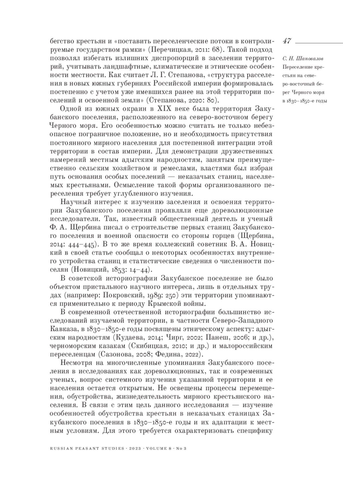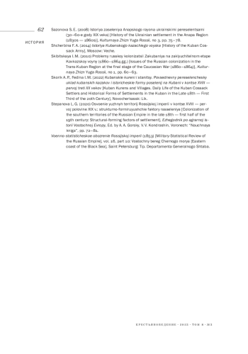 17. 	Степанова Л. Г. (2020). Освоение южных территорий Российской империи в конце XVIII - первой половине XIX в.: структурно-формирующие факторы расселения // Ежегодник по аграрной истории Восточной Европы. 2020 год: Социальный мир деревни X-XXI вв.: земельные собственники/землевладельцы и земледельцы / Отв. ред. А. А. Горский, В. В. Кондрашин. Воронеж: Издательско-полиграфический центр “Научная книга”. С. 72-81.