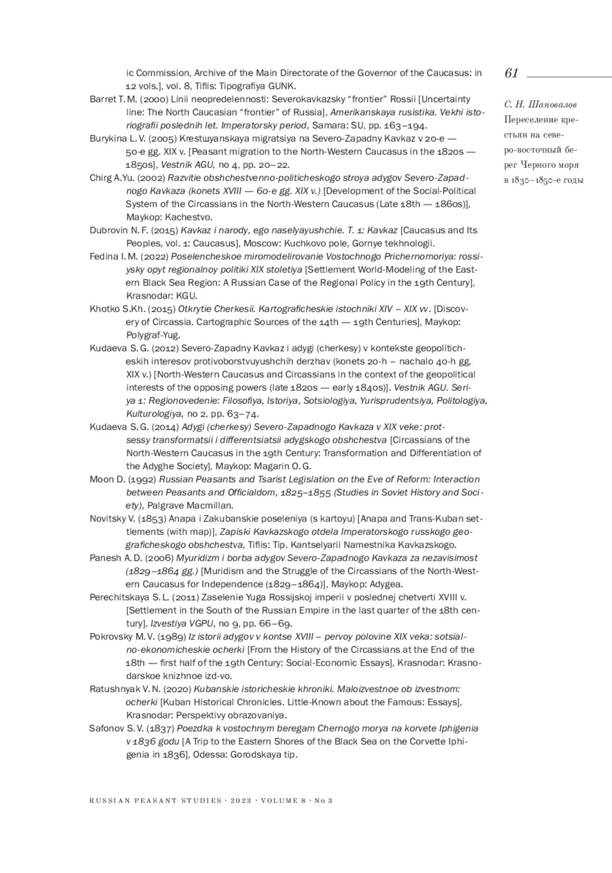 3. 	Бурыкина Л. В. (2005). Крестьянская миграция на Северо-Западный Кавказ в 20-50-е гг. XIX в. // Вестник Адыгейского государственного университета. № 4. С. 20-22.  EDN: JYBJRT